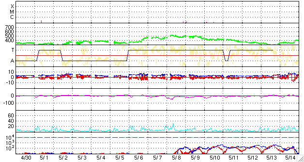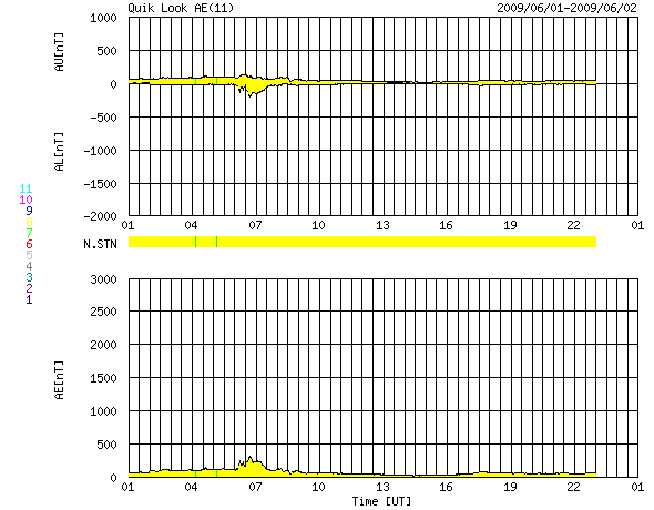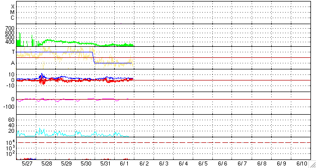 2009/ 6/ 2 09:05 更新 1019黒点群は強まっている様です。小規模のフレアが見られるかもしれません。太陽風は低速で、穏やかです。 担当 篠原 1019黒点群は、規模が大きくなっています。 可視光写真で、黒点も大きく見える様になりましたが、 GOESのX線データが、最低レベルを脱して、 Aクラスの範囲で変動する様になったのです。 フレア活動としてX線強度が A, Bクラスに上がるのではなく、 ベースラインがここまで上がるのは、かなり久しぶりのことです。 基準がはっきりしない話ですが、 2008年3月下旬〜4月上旬の太陽活動以来、およそ1年ぶりと言えそうです。 (過去のニュースを参照して下さい) 太陽活動は、次のステップに進みつつあるのかもしれません。 今後、1019黒点群が小規模のフレアを起こす可能性もあります。 太陽風は、320km/秒前後の遅い状態を保っています。 磁場強度は、3〜4nTとやや弱めです。 磁気圏活動も静穏です。 太陽風磁場の南北成分が、弱い南寄りを保っていたので、 AE指数のグラフが少し太めになっていますが、全体的にはとても穏やかです。 今日いっぱいは、静かな状態が続くでしょう。 今夜か明日くらいから、太陽風速度の高まりが回帰して来る可能性があります。 SOHO EIT195では、発生源のコロナホールが見えなくなっていたので、 太陽風の変化も弱まっているかもしれません。 SOHO MDIによる、太陽可視光写真。北東(右上)に1019黒点群が見えています。2日6時(世界時1日21時)。 (c) SOHO (ESA & NASA) ![]() SOHO EIT195による、太陽コロナの様子。2日9時(世界時2日0時)。 (c) SOHO (ESA & NASA) ![]() GOES衛星の太陽X線データ (c) NOAA/SWPC ![]() ACEが観測した太陽風の磁場(1番上の枠、白線は全体の強度、赤線は南北成分) および、太陽風の密度(3番目の橙線)、速度(4番目の黄線) (c) NOAA/SWPC ![]() リアルタイムAE指数 下段のAEグラフの値が高くなると、オーロラ活動が活発化しています。 (c) 京都大学, NICT ![]() シベリアで観測された3日間の磁場データ 右側の3分の1が、昨日のデータになります。グラフが上がったり下がったりすると、オーロラ活動が活発化しています。 (c) NICT ![]() 27日の太陽周期に合わせたデータプロット 太陽が同じ面を地球に向けていた27日前の変化から、今後を予想することができます。 (c) NICT