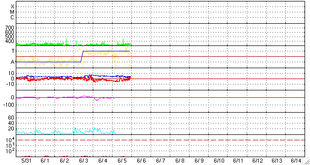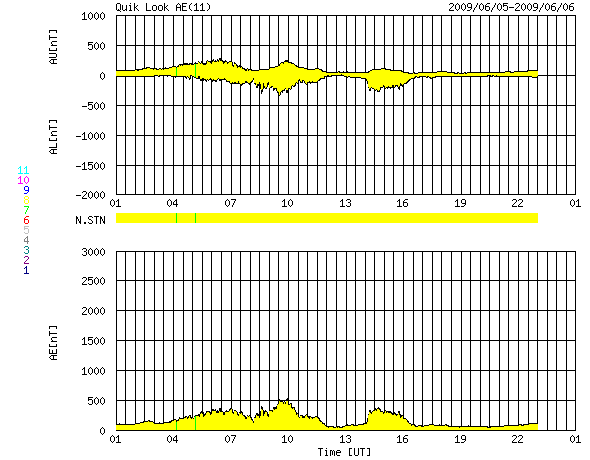 2009/ 6/ 6 09:28 更新 1019黒点群は見えなくなりました。低速の太陽風が続いています。 担当 篠原 1019黒点群は消えてしまった様です。 SOHO EIT195では、1019群の場所は明るく光っていますが、 可視光写真では、黒点は見えなくなっています。 X線の変動は、一段と小さくなっています。 太陽は、また一休みというところでしょうか。 太陽風も、遅い状態が続いています。 速度は若干上がって、330km/秒になっていますが、 かなり遅めであることは変わっていません。 太陽風磁場の南北成分は、 昨日いっぱい、-4nTほどの南向きがずっと続きました。 この影響で、AE指数のグラフも、太い状態が続きました。 昨日のグラフは、更に太くなっていて、 300〜500nTくらいの変化が連続的に見られています。 この長時間太くなる変化は、オーロラが活発になったというよりも、 磁気圏全体の対流が強められたことによる変化と考えられます。 長い時間、南向きの太陽風磁場が安定して続く時に見られる変化パターンです。 太陽風磁場の南北成分は、今朝くらいから北向きにも変わる様になりました。 このため、磁気圏活動は弱まっているようです。 この後は、磁気圏も穏やかな状態になりそうです。 SOHO EIT195では、太陽コロナは全体的にのっぺりとしています。 低速の太陽風は当分続きそうです。 SOHO MDIによる、太陽可視光写真。中央上部に、1019黒点群が見えています。6日6時(世界時5日21時)。 (c) SOHO (ESA & NASA) ![]() SOHO EIT195による、太陽コロナの様子。6日9時(世界時6日0時)。 (c) SOHO (ESA & NASA) ![]() GOES衛星の太陽X線データ (c) NOAA/SWPC ![]() ACEが観測した太陽風の磁場(1番上の枠、白線は全体の強度、赤線は南北成分) および、太陽風の密度(3番目の橙線)、速度(4番目の黄線) (c) NOAA/SWPC ![]() リアルタイムAE指数 下段のAEグラフの値が高くなると、オーロラ活動が活発化しています。 (c) 京都大学, NICT ![]() シベリアで観測された3日間の磁場データ 右側の3分の1が、昨日のデータになります。グラフが上がったり下がったりすると、オーロラ活動が活発化しています。 (c) NICT ![]() 27日の太陽周期に合わせたデータプロット 太陽が同じ面を地球に向けていた27日前の変化から、今後を予想することができます。 (c) NICT