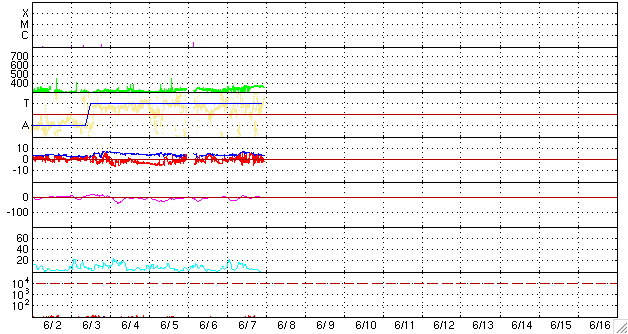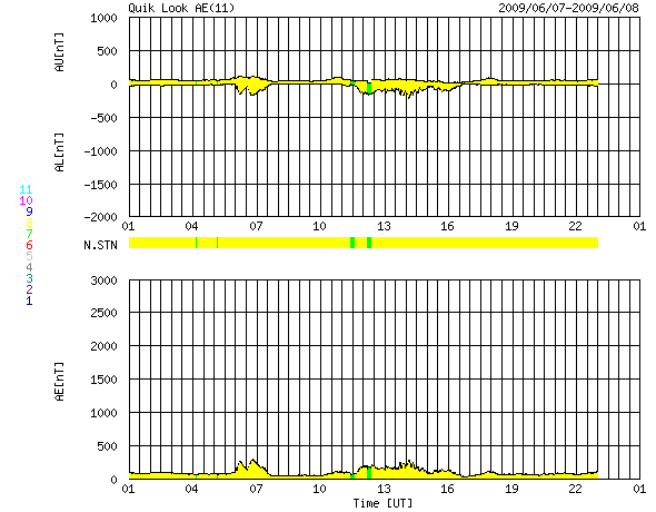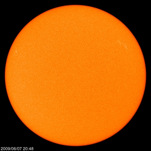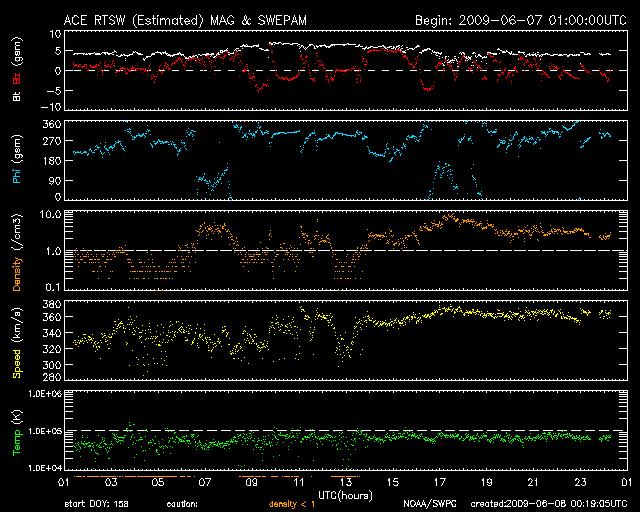 2009/ 6/ 8 09:19 更新 太陽風は300km/秒台中盤で穏やかです。太陽は無黒点で静穏です。 担当 篠原 昨日のニュース以降、太陽風の速度は340km/秒の状態を保ち、 今日になった頃から360km/秒へ、もう少し上がっています。 低速風であることに変わりはなく、穏やかな太陽風が続いています。 磁場強度は、5nT付近で安定しています。 速度が340km/秒から360km/秒へ上がった頃に、磁場強度も少し強まりましたが、 どちらもごくわずかな変動です。 磁気圏も概ね静穏です。 AE指数には、200nTほどの小さな変化が見られるだけです。 AE指数の変動は、太陽風磁場の南向きと関係しているかと思ったのですが、 ACEの図の南北成分(赤線)と見比べると、うまく時間帯が合いません。 タイミングとしては、磁場の南向きの方が遅れている様に見えます。 太陽は無黒点で、静穏です。 SOHO EIT195では、北半球の東西に明るい活動領域が見えています。 可視光写真で見比べると、それぞれに白斑が見えています。 東側(左側)の活動領域は、前周期に1017黒点群が現れた領域です。 北半球の中ほどには、小さなコロナホールも見えています。 これは、前周期にはなかったものです。 規模は小さいので、地球への目立った影響はなさそうですが、 今後の変化が楽しみです。 SOHO EIT195による、太陽コロナの様子。8日9時(世界時8日0時)。 (c) SOHO (ESA & NASA) ![]() SOHOによる、太陽可視光写真。無黒点ですが、両端に白斑が見えています。8日6時(世界時7日21時)。 (c) SOHO (ESA & NASA) ![]() ACEが観測した太陽風の磁場(1番上の枠、白線は全体の強度、赤線は南北成分) および、太陽風の密度(3番目の橙線)、速度(4番目の黄線) (c) NOAA/SWPC ![]() リアルタイムAE指数 下段のAEグラフの値が高くなると、オーロラ活動が活発化しています。 (c) 京都大学, NICT ![]() シベリアで観測された3日間の磁場データ 右側の3分の1が、昨日のデータになります。グラフが上がったり下がったりすると、オーロラ活動が活発化しています。 (c) NICT ![]() 27日の太陽周期に合わせたデータプロット 太陽が同じ面を地球に向けていた27日前の変化から、今後を予想することができます。 (c) NICT