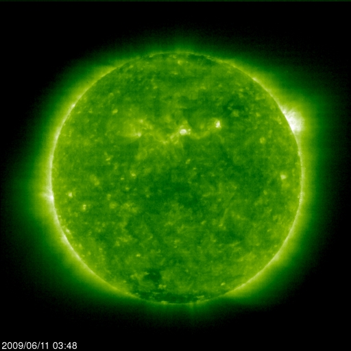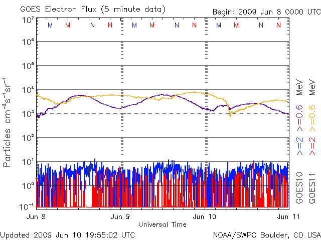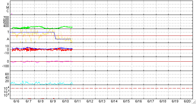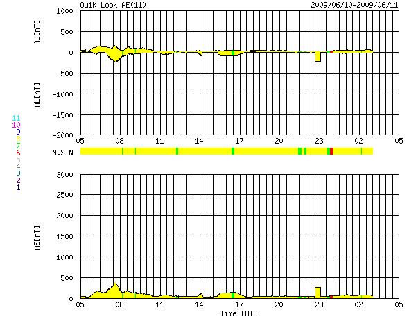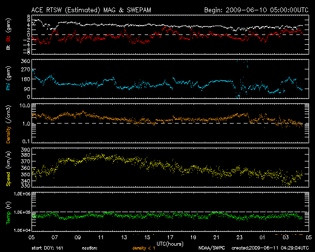 2009/ 6/11 13:30 更新 300km/秒台の低速の太陽風が続いています。磁気圏も概ね静穏です。 担当 篠原 昨日は、ニュースの後、夕方にかけて太陽風の速度が370km/秒へ上がり、 その後下がって、現在は340km/秒へ戻っています。 一時的な速度変動がやって来た様です。 27日周期の図で前周期を見ると、同じ様な速度の変化がこのあたりに見られています。 小さな変化ばかりですが、前周期とある程度関係しているのかもしれません。 磁気圏は概ね静穏です。 太陽風の変化に対応して、小規模のオーロラ活動も見られていますが、 太陽風の変化自体が小さなものでしたので、影響も限定的です。 穏やかな状態は、このまま続きそうです。 SOHO EIT195の太陽コロナは、全体的にのっぺりしていて、 コロナホールは見られず、 高速風が来る見込みは、今のところありません。 太陽も無黒点で静穏です。 SOHO EIT195による、太陽コロナの様子。11日13時(世界時11日4時)。 (c) SOHO (ESA & NASA) ![]() ACEが観測した太陽風の磁場(1番上の枠、白線は全体の強度、赤線は南北成分) および、太陽風の密度(3番目の橙線)、速度(4番目の黄線) (c) NOAA/SWPC ![]() リアルタイムAE指数 下段のAEグラフの値が高くなると、オーロラ活動が活発化しています。 (c) 京都大学, NICT ![]() シベリアで観測された3日間の磁場データ 右側の3分の1が、昨日のデータになります。グラフが上がったり下がったりすると、オーロラ活動が活発化しています。 (c) NICT ![]() 27日の太陽周期に合わせたデータプロット 太陽が同じ面を地球に向けていた27日前の変化から、今後を予想することができます。 (c) NICT