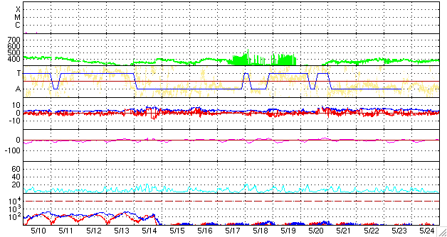 右側の3分の1が、昨日のデータになります。グラフが上がったり下がったりすると、オーロラ活動が活発化しています。