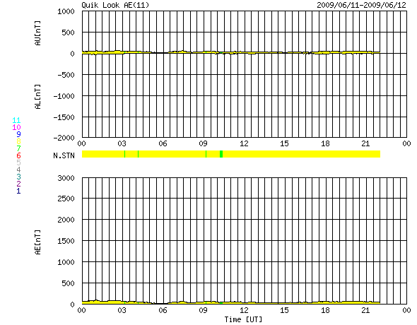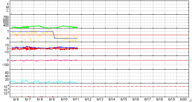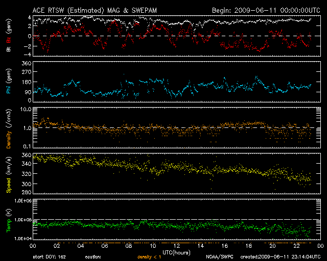 - 2009/ 6/11 13:30 300km/秒台の低速の太陽風が続いています。磁気圏も概ね静穏です。
