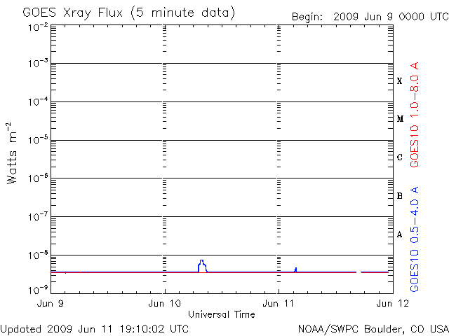 - 2009/ 6/ 7 12:54 太陽風は低速で、磁気圏も静かです。太陽は無黒点ですが、B2の小さなフレアが起きています。