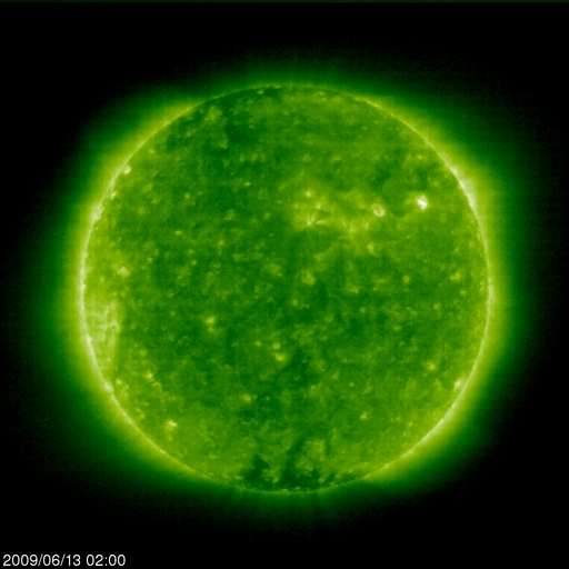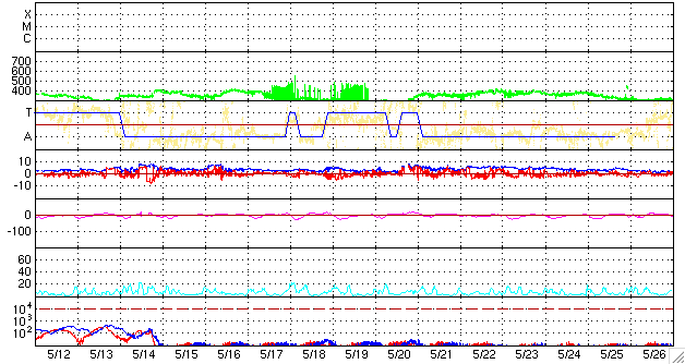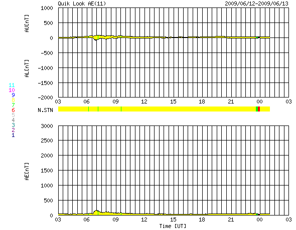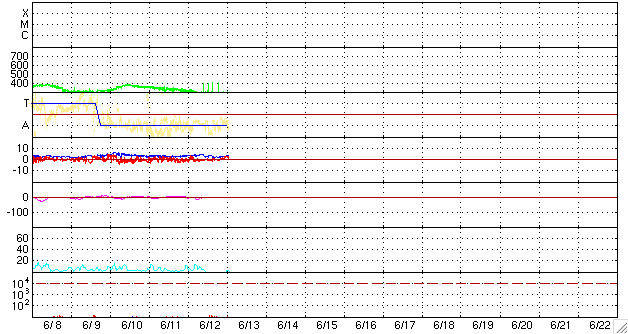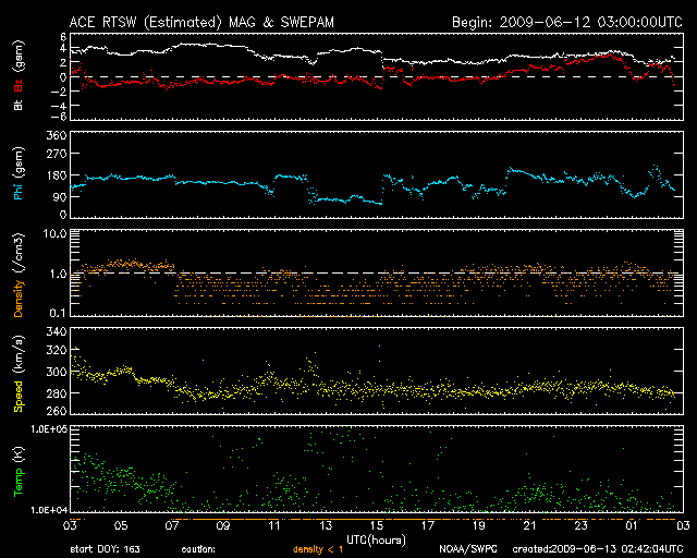 2009/ 6/13 11:42 更新 太陽風の速度は280km/秒に下がり、磁気圏もたいへん静かです。 担当 篠原 穏やかな宇宙天気が続いています。 太陽風の速度は、280km/秒に下がり、かなり低速です。 磁場強度も3nT前後に弱まっています。 このため、磁気圏もたいへん穏やかです。 AE指数は、ほとんど変化が見られません。 SOHO EIT195の太陽コロナも、全体的にぼんやりと光っていて、 コロナホールなどの目立った構造は見られません。 この後も、穏やかな太陽風が続くと予想されます。 27日周期の図では、1周期分全く高速風領域がなく、 次に、どこに高速風が立ち上がってくるのかを、注目している状態です。 太陽は無黒点です。 X線にも全く変化は見られません。 こちらも、まだまだ安定して黒点が出現するという状況ではないようです。 SOHO EIT195による、太陽コロナの様子。13日11時(世界時13日2時)。 (c) SOHO (ESA & NASA) ![]() ACEが観測した太陽風の磁場(1番上の枠、白線は全体の強度、赤線は南北成分) および、太陽風の密度(3番目の橙線)、速度(4番目の黄線) (c) NOAA/SWPC ![]() リアルタイムAE指数 下段のAEグラフの値が高くなると、オーロラ活動が活発化しています。 (c) 京都大学, NICT ![]() シベリアで観測された3日間の磁場データ 右側の3分の1が、昨日のデータになります。グラフが上がったり下がったりすると、オーロラ活動が活発化しています。 (c) NICT ![]() 27日の太陽周期に合わせたデータプロット 太陽が同じ面を地球に向けていた27日前の変化から、今後を予想することができます。 (c) NICT