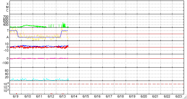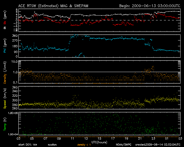 2009/ 6/14 11:52 更新 太陽風はかなり低速で、磁気圏も静穏です。太陽も無黒点のままです。 担当 篠原 速度280km/秒のかなり遅い太陽風が続いています。 この1日間は、プラズマの密度が下がっていて、 1立方cmあたり0.1〜0.2個程度になっています。 この期間は、前周期でも密度が下がっていて、その構造が残っていた様です。 プラズマの密度が下がると、ACEの太陽風速度の観測値がばらつくようになります。 今日の図でも幾分ばらつきが見られます。 前周期は、この後2日ほど太陽風の薄い状態が続きました。 今回はどうなるでしょうか。 太陽風の磁場強度は、4〜6nTと、平均的な状態に戻っています。 途中、南向きに振れたりして、AE指数に小さな変動を作っていますが、 そもそも速度がかなり下がっているので、地球への影響は小さなものだけです。 SOHO EIT195の太陽コロナは、全体的にぼんやりとしていて、 穏やかな状態はこのまま続きそうです。 STEREO Behindで3日半ほど先回りすると(小さい写真)、 太陽の東端(左端)の中緯度あたりに、薄暗いコロナホールが見えてきました。 これがこちら側に来るのを待ちましょう。 太陽は、昨日の写真のままですが、現在も無黒点の様です。 X線のグラフも静かです。 SOHO EIT195による、太陽コロナの様子。14日11時(世界時14日2時)。 (c) SOHO (ESA & NASA) ![]() STEREO behind衛星による太陽コロナ写真。地球よりも、3日半ほど先の太陽です。14日11時(世界時14日2時)。 (c) NASA ![]() SOHOによる太陽の可視光写真。黒点はありません。13日2時半(世界時12日17時半)。 (c) SOHO (ESA & NASA) ![]() ACEが観測した太陽風の磁場(1番上の枠、白線は全体の強度、赤線は南北成分) および、太陽風の密度(3番目の橙線)、速度(4番目の黄線) (c) NOAA/SWPC ![]() リアルタイムAE指数 下段のAEグラフの値が高くなると、オーロラ活動が活発化しています。 (c) 京都大学, NICT ![]() シベリアで観測された3日間の磁場データ 右側の3分の1が、昨日のデータになります。グラフが上がったり下がったりすると、オーロラ活動が活発化しています。 (c) NICT ![]() 27日の太陽周期に合わせたデータプロット 太陽が同じ面を地球に向けていた27日前の変化から、今後を予想することができます。 (c) NICT