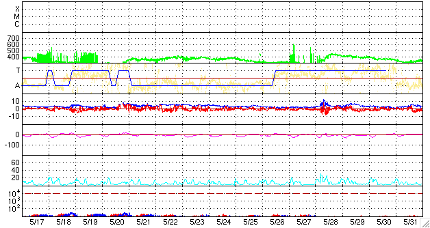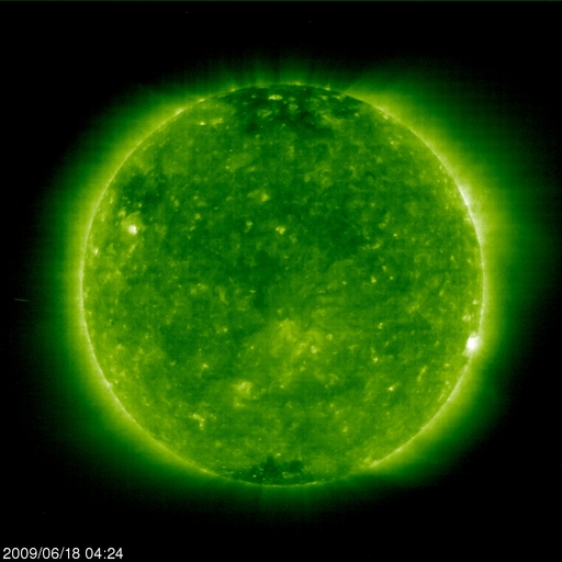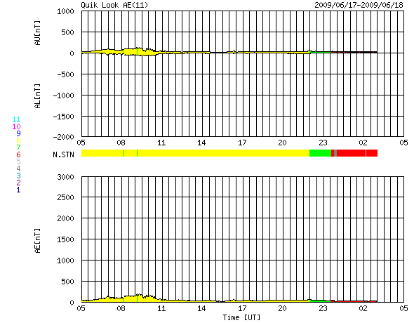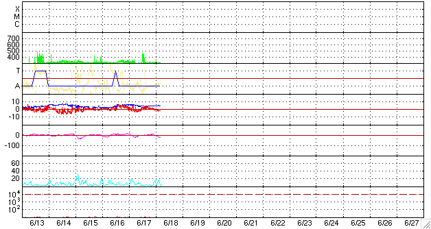 2009/ 6/18 13:48 更新 太陽風は、300km/秒と低速状態が続いています。黒点は消えました。 担当 篠原 昨日現れた小さな黒点は、NOAAで、1021黒点群と番号が付けられました。 ただし、1日も経たないうちに消えてしまいました。 今日の写真では、南西(右下)の端に、名残りの白斑が見えるだけです。 SOHO EIT195では、明るく光っていますので、探す時はこちらを参考にしてください。 現在の太陽は、無黒点です。 X線のグラフには変化はなく、とても静かです。 太陽風は、低速状態が続いています。 速度は、昨日より300km/秒前後でほぼ安定しています。 磁場強度も、5nTと平均的な強さを保っています。 そして、磁気圏活動も穏やかです。 太陽風磁場の南向きの影響を受けて、AE指数の前半に小さな変化がありますが、 以降は、全く変化していません。 今後も、速度の遅い穏やかな太陽風が続くと予想されます。 SOHO EIT195では、東の端(左端)に、 STEREO Behindで見えていたコロナホールが姿を現しました。 もう3〜4日ほどすると、よりはっきり見える様になるでしょう。 しかし、規模はそれほど大きくなく、たいした影響は来ないだろうと思います。 SOHO EIT195による、太陽コロナの様子。18日13時半(世界時18日4時半)。 (c) SOHO (ESA & NASA) ![]() SOHOによる、太陽可視光写真。黒点群は消えました18日9時(世界時18日0時)。 (c) SOHO (ESA & NASA) ![]() GOES衛星の太陽X線データ (c) NOAA/SWPC ![]() ACEが観測した太陽風の磁場(1番上の枠、白線は全体の強度、赤線は南北成分) および、太陽風の密度(3番目の橙線)、速度(4番目の黄線) (c) NOAA/SWPC ![]() リアルタイムAE指数 下段のAEグラフの値が高くなると、オーロラ活動が活発化しています。 (c) 京都大学, NICT ![]() シベリアで観測された3日間の磁場データ 右側の3分の1が、昨日のデータになります。グラフが上がったり下がったりすると、オーロラ活動が活発化しています。 (c) NICT ![]() 27日の太陽周期に合わせたデータプロット 太陽が同じ面を地球に向けていた27日前の変化から、今後を予想することができます。 (c) NICT