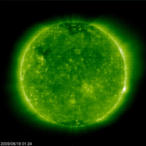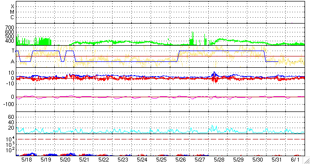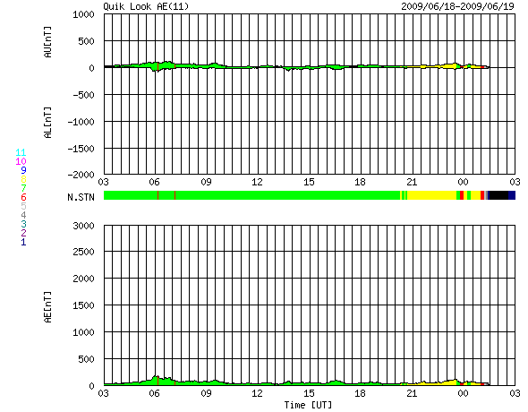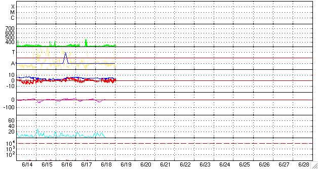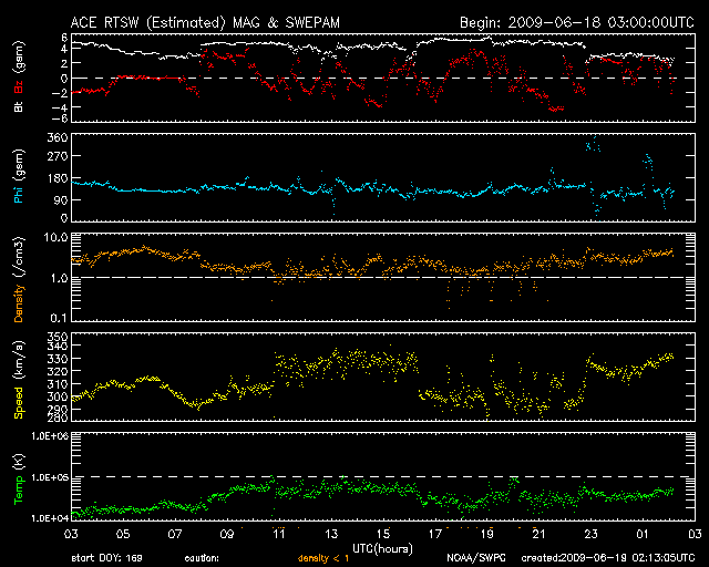 2009/ 6/19 11:14 更新 300km/秒付近の遅い太陽風が続いています。太陽も無黒点で静穏です。 担当 篠原 低速の太陽風が続いています。 ACE衛星の観測によると、 太陽風の速度は、300〜320km/秒と遅い状態が続いています。 磁場強度は4nT付近で、平均的な強さで安定しています。 磁気圏活動もずっと静かです。 AE指数はほとんど変化していません。 太陽風に周期性の高速風が消えたことで、AE指数も静かな状態が長く続いています。 ある程度の規模でオーロラが変動したということで、 AE指数が1000nTに達したときを探すと、 5月8日が最後でした(これも一瞬の変化でしたが)。 もう、40日を超えて、目立ったオーロラ活動は発生していないということになります。 この後も、静かな状態が続きます。 SOHO EIT195では、東側(左側)からコロナホールが上がって来ましたが、 規模は小さそうで、目立った影響はないのではないかと思われます。 太陽は無黒点のままです。 活動度は高まりそうで、高まらず、じらされる毎日ですね。 SOHO EIT195による、太陽コロナの様子。19日10時半(世界時19日1時半)。 (c) SOHO (ESA & NASA) ![]() ACEが観測した太陽風の磁場(1番上の枠、白線は全体の強度、赤線は南北成分) および、太陽風の密度(3番目の橙線)、速度(4番目の黄線) (c) NOAA/SWPC ![]() リアルタイムAE指数 下段のAEグラフの値が高くなると、オーロラ活動が活発化しています。 (c) 京都大学, NICT ![]() シベリアで観測された3日間の磁場データ 右側の3分の1が、昨日のデータになります。グラフが上がったり下がったりすると、オーロラ活動が活発化しています。 (c) NICT ![]() 27日の太陽周期に合わせたデータプロット 太陽が同じ面を地球に向けていた27日前の変化から、今後を予想することができます。 (c) NICT