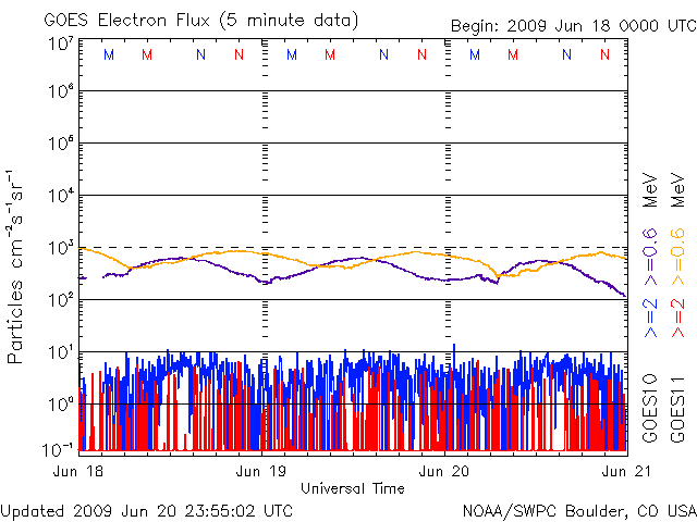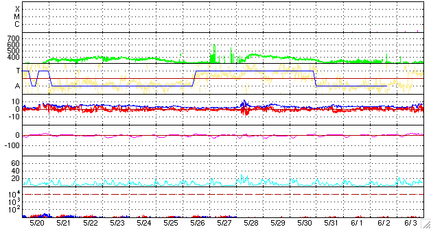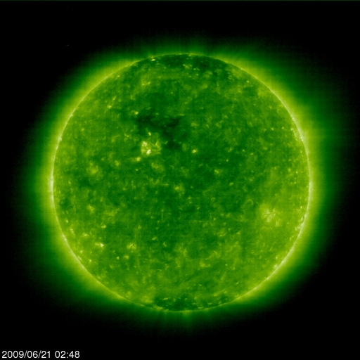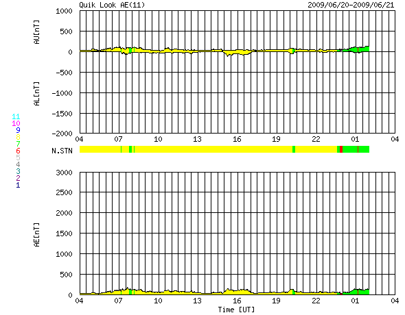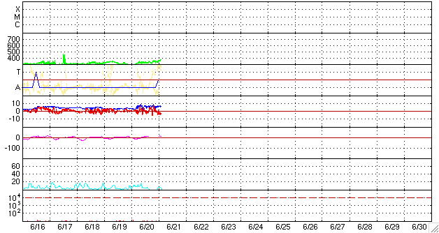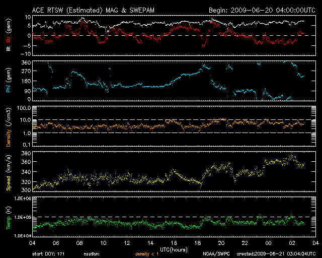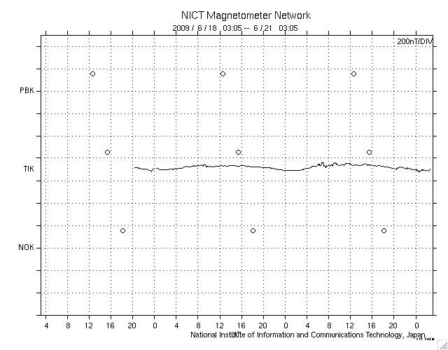 2009/ 6/21 12:05 更新 太陽風速度は、360km/秒にやや上がっていますが、太陽風、磁気圏は静穏です。 担当 篠原 太陽風の速度は、300km/秒から360km/秒へ少し上昇しています。 今の所、低速である事に変わりはありません。 一方、磁場強度は、6nTと少しだけ強めになっています。 あるいは、もうしばらく速度が上がるのかもしれません。 それでも、400km/秒台に上がる程度でしょう。 磁気圏活動も静穏です。 AE指数には全く変化が見られません。 そして、SOHO EIT195では、コロナホールが太陽の中心線に達しつつあります。 正面から見られる様になったので、コロナホールの濃さも良く分かる様になりました。 こうして見ると、広さは小さいですが、しっかりと暗くなっているので、 それなりに高速の太陽風がやってくるかもしれません。 到来は、3〜4日後くらい、 24日の後半か、25日になりそうです。 久しぶりの高速風の到来となるでしょうか。 太陽は無黒点で、非常に穏やかです。 SOHO EIT195による、太陽コロナの様子。21日11時半(世界時21日2時半)。 (c) SOHO (ESA & NASA) ![]() ACEが観測した太陽風の磁場(1番上の枠、白線は全体の強度、赤線は南北成分) および、太陽風の密度(3番目の橙線)、速度(4番目の黄線) (c) NOAA/SWPC ![]() リアルタイムAE指数 下段のAEグラフの値が高くなると、オーロラ活動が活発化しています。 (c) 京都大学, NICT ![]() シベリアで観測された3日間の磁場データ 右側の3分の1が、昨日のデータになります。グラフが上がったり下がったりすると、オーロラ活動が活発化しています。 (c) NICT ![]() 27日の太陽周期に合わせたデータプロット 太陽が同じ面を地球に向けていた27日前の変化から、今後を予想することができます。 (c) NICT