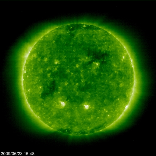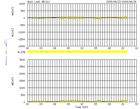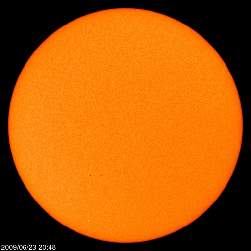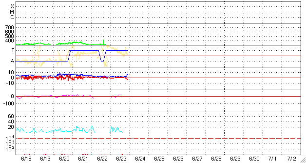 2009/ 6/24 08:33 更新 太陽風の速度は265km/秒にまで下がり、かなり低速です。これから、太陽風の速度変化がやって来るでしょう。 担当 篠原 1022黒点群は、完全に見えなくなり、 太陽面には、1023黒点群だけが残っています。 1023群の黒点の数は、昨日よりも増えていますが、 X線のグラフにフレアの変化は全く無く、静かな黒点群です。 太陽は、この後も穏やかに推移するでしょう。 太陽風は、さらに速度が下がり、265km/秒付近となっています。 ここまで下がると、かなりの低速太陽風です。 磁場強度も、2nTに弱まっていましたが、 今朝になって、5nTに回復しています。 磁気圏もたいへん静かです。 AE指数のグラフには、全く変化がありません。 SOHO EIT195の太陽コロナ写真を見て下さい。 北半球側のコロナホールは、中心線を過ぎて西側(右側)にせり出し、 そろそろ地球への影響開始位置である、西半球の真ん中あたりに達します。 コロナホールの位置や27日周期の図より、 太陽風の変化は、今日の午後か明日くらいに始まるのではないかと予想しています。 現在、ACEのデータでは、太陽風磁場の強まりが見られています。 あるいは、これが速度変化の兆しにあたるのかもしれません。 そうであれば、速度の変化は早めの到来となりそうです。 コロナホールの規模を見ると、 500km/秒台に達するくらいの太陽風が来るのではないかと思います。 継続時間は長くはならず、3日程度で一段落つくのではないでしょうか。 また、太陽の南半球の東側にも、次のコロナホールが見えています。 ここは、前周期にもぼんやりとコロナホールがあるように見えていたのですが、 今回は、はっきりと見えています。 来週の前半に、こちらの影響もやって来そうです。 SOHO EIT195による太陽コロナ。23日2時(世界時23日17時)。 (c) SOHO (ESA & NASA) ![]() SOHOによる太陽可視光写真。1023黒点群が見えています。24日6時(世界時23日21時)。 (c) SOHO (ESA & NASA) ![]() GOES衛星の太陽X線データ (c) NOAA/SWPC ![]() ACEが観測した太陽風の磁場(1番上の枠、白線は全体の強度、赤線は南北成分) および、太陽風の密度(3番目の橙線)、速度(4番目の黄線) (c) NOAA/SWPC ![]() リアルタイムAE指数 下段のAEグラフの値が高くなると、オーロラ活動が活発化しています。 (c) 京都大学, NICT ![]() シベリアで観測された3日間の磁場データ 右側の3分の1が、昨日のデータになります。グラフが上がったり下がったりすると、オーロラ活動が活発化しています。 (c) NICT ![]() 27日の太陽周期に合わせたデータプロット 太陽が同じ面を地球に向けていた27日前の変化から、今後を予想することができます。 (c) NICT