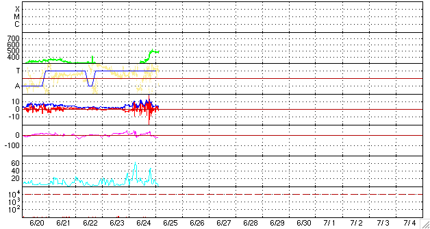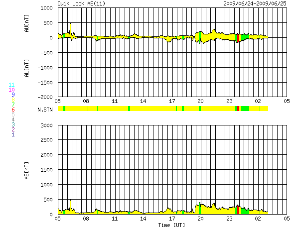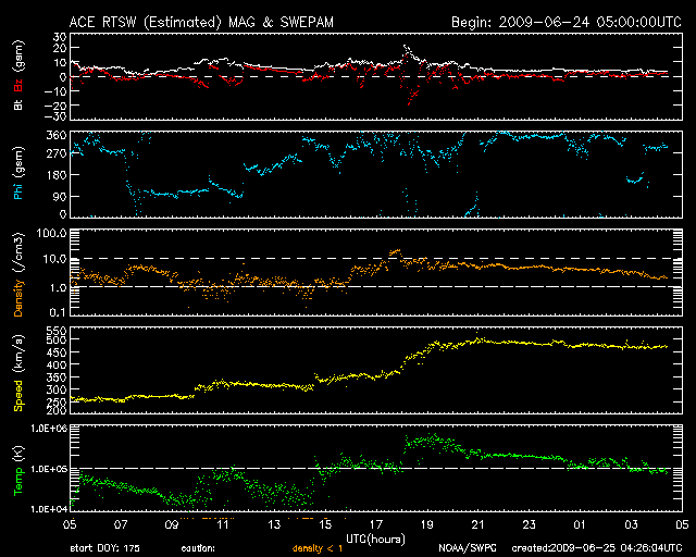 2009/ 6/25 13:26 更新 太陽風速度は500k/秒に上昇し、強い南向き磁場も発生しました。磁気圏は小規模の乱れです。 担当 篠原 太陽風速度の上昇がやって来ました。 昨夜、24日23時(世界時24日14時)頃から速度の上昇が始まり、 今朝、25日6時(世界時24日21時)頃に、500km/秒に達しました。 速度の上昇はそこで落ち着いて、 その後はゆっくりと下がり始め、現在は460km/秒です。 だいたい予想通りのタイミングで、 最高速度も見込んだ程度の規模になっています。 今回の太陽風の変化で興味深いのは、磁場の変化です。 ACEの磁場強度のグラフ(白線)は、 24日20時(世界時24日11時)に10nTの強い山、 25日3時(世界時24日18時)に20nTの更に強い山を記録しています。 速度も密度も、ほとんど変化していないのに、 磁場だけが突出して大きく変化しました。 このため、南向きの磁場もかなり強いものが観測されていて、 後半の山では、短時間ながら、-20nTにも達しています。 しかし、変化が大きかった割に、 短時間で、速度も低かったためか、 地球側ではそれほど目立った変化にはなっていません。 沖縄の磁場データでは、25日5時(世界時24日20時)前後に、 -40nTほどの磁場強度の減少が記録されています。 ここで、磁気圏の環電流(リングカレント)が発達し、弱い磁気嵐になったようです。 世界中のデータを用いるDstのグラフも、同じくらいの減少幅となっています。 一方、極域のデータであるAE指数は、せいぜい300nTほどの変化に留まっていて、 小さな活動が見られただけでした。 全体的に見て、磁気圏への影響は限定的だったと言えます。 この後、太陽風の速度は、もうしばらく高めの状態を保ち、 明日くらいには、下がり始めるのではないかと思います。 コロナホールの大きさから考えて、乱れはそれほど続かないでしょう。 また、SOHO EIT195では、次のコロナホールが太陽の中心線に達しつつあります。 3-4日後には、今度はこちらの影響が及ぶ可能性があります。 こちらも小規模だと思いますが、前周期には見られなかった変化なので、 注目して下さい。 太陽は、1023黒点群が小さくなって残っています。 フレア活動はなく、とても静穏です。 SOHO EIT195による太陽コロナ。25日13時(世界時25日4時)。 (c) SOHO (ESA & NASA) ![]() SOHOによる太陽可視光写真。1023黒点群が見えています。25日10時半(世界時25日1時半)。 (c) SOHO (ESA & NASA) ![]() ACEが観測した太陽風の磁場(1番上の枠、白線は全体の強度、赤線は南北成分) および、太陽風の密度(3番目の橙線)、速度(4番目の黄線) (c) NOAA/SWPC ![]() 沖縄の磁場擾乱 下へ下がるほど、擾乱が発達している事を意味します。 (c) NICT ![]() リアルタイムAE指数 下段のAEグラフの値が高くなると、オーロラ活動が活発化しています。 (c) 京都大学, NICT ![]() シベリアで観測された3日間の磁場データ 右側の3分の1が、昨日のデータになります。グラフが上がったり下がったりすると、オーロラ活動が活発化しています。 (c) NICT ![]() 27日の太陽周期に合わせたデータプロット 太陽が同じ面を地球に向けていた27日前の変化から、今後を予想することができます。 (c) NICT