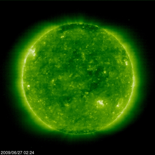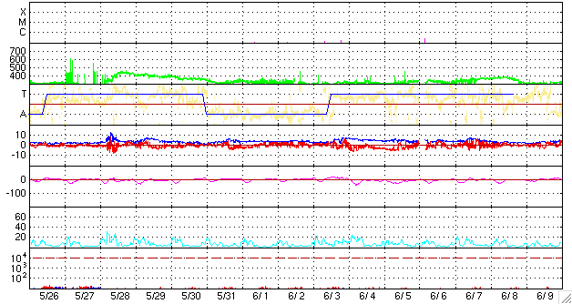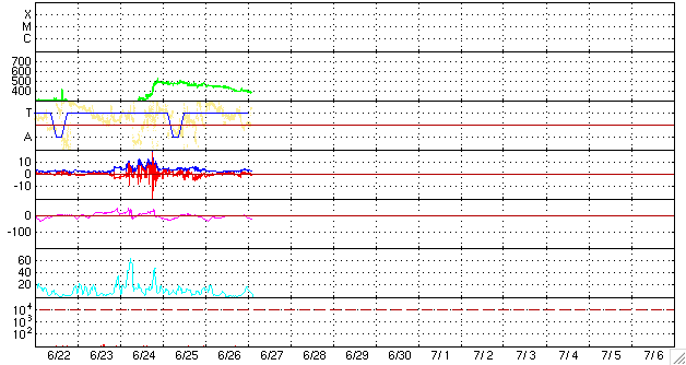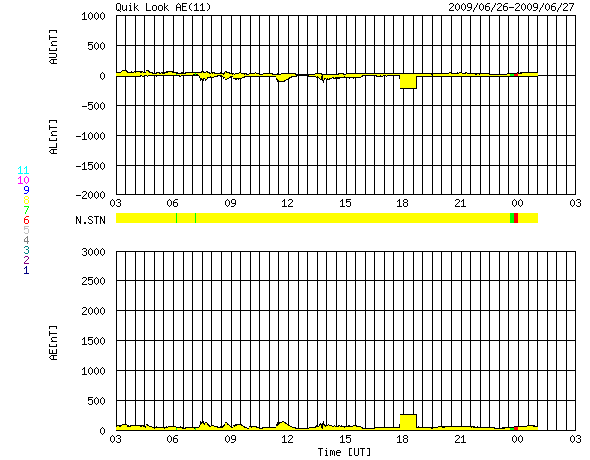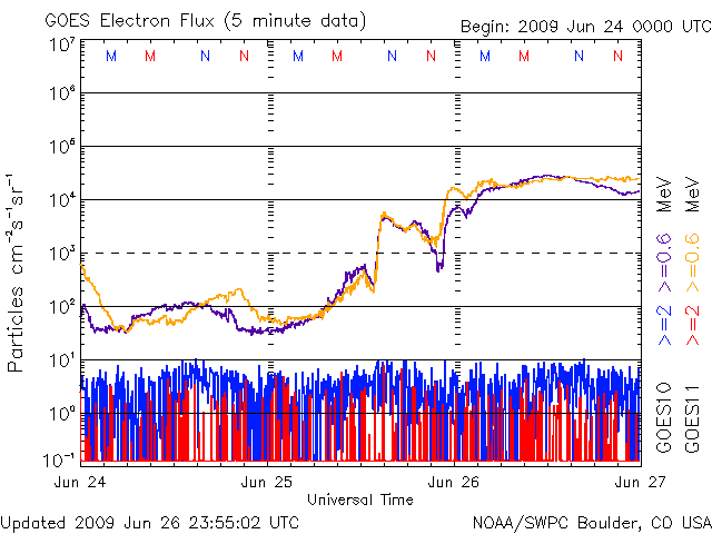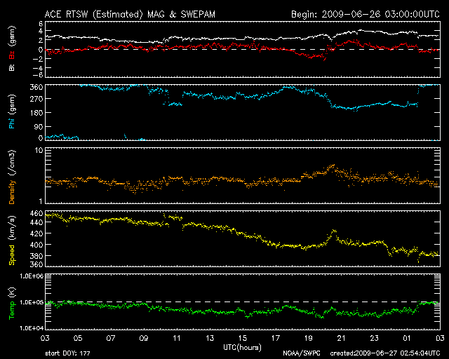 2009/ 6/27 11:55 更新 太陽風の速度は400km/秒を割り、通常の状態に戻りました。太陽は無黒点です。 担当 篠原 昨日のニュース以降も、太陽風の速度はゆっくりと下がり続け、 日付が27日に変わった頃、400km/秒を割りました。 現在は、もう少し下がって、380km/秒となっています。 太陽風の速度の高まりは終わり、通常レベルに戻っています。 磁場強度は、3nTを前後していて、やや弱めの状態で安定しています。 磁気圏もとても静かです。 AE指数は全く変化がありませんし、 シベリアの磁場データも、一昨日(左3分の1)、昨日(中央部)は、小さな変化が見られましたが、 今日(右3分の1)は、完全に平らになっています。 このところ、すっかり元気をなくしているのが、放射線帯の高エネルギー電子です (宇宙環境としては、良いことですが)。 掲載しているGOESのグラフでは、赤線と青線のグラフは、下の方にべったりとくっついています。 こちらの27日周期の図の「静止軌道電子」を見てください。 5月15日に、この2本の線が100 (10^2) のレベル(これも高い数値ではありません)を割って以来、43日間、 太陽の自転で1回転半の間、とても低い状態が続いています。 まともな規模の高速風領域が無い現状では、高エネルギー電子も高まることがありません。 太陽風の静けさは、こういうところにも影響しています。 その太陽風ですが、明日か明後日くらいに、規模の小さな高速風がやって来る可能性があります。 発生源のコロナホールは、太陽の中心を過ぎ、西半球(右半分)側に入っています。 今日の写真では、コロナホールはやや見にくくなっています。 2〜3日ほどで乱れが終わると、再び穏やかな太陽風が続くことになります。 太陽は、無黒点で静穏です。 SOHO EIT195による太陽コロナ。27日11時半(世界時27日2時半)。 (c) SOHO (ESA & NASA) ![]() ACEが観測した太陽風の磁場(1番上の枠、白線は全体の強度、赤線は南北成分) および、太陽風の密度(3番目の橙線)、速度(4番目の黄線) (c) NOAA/SWPC ![]() リアルタイムAE指数 下段のAEグラフの値が高くなると、オーロラ活動が活発化しています。 (c) 京都大学, NICT ![]() シベリアで観測された3日間の磁場データ 右側の3分の1が、昨日のデータになります。グラフが上がったり下がったりすると、オーロラ活動が活発化しています。 (c) NICT ![]() 27日の太陽周期に合わせたデータプロット 太陽が同じ面を地球に向けていた27日前の変化から、今後を予想することができます。 (c) NICT