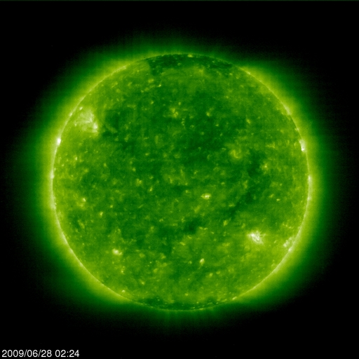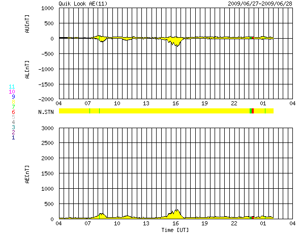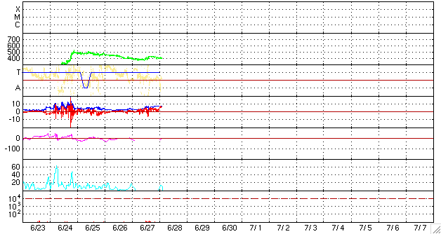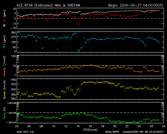 2009/ 6/28 12:20 更新 太陽風は400km/秒前後で穏やかです。この後、速度の上昇が始まるかもしれません。 担当 篠原 穏やかな太陽風が続いています。 速度は、400km/秒を前後していて、平均的な速さです。 磁場強度は、昨日までは3nTでしたが、 今日に入った頃からゆっくりと強まっていて、 現在8nT近くにやや強まっています。 27日周期の図を見ると、前周期もこの頃は磁場強度がやや強まっていたので、 それが回帰してきた可能性があります。 磁気圏は概ね静穏です。 AE指数には、200〜300nTほどの小さな活動が2つほど見られますが、 その他は完全に静かです。 これから、小規模の高速太陽風がやって来る可能性があります。 SOHO EIT195の太陽コロナに見えていた、コロナホールによるものです。 今日の写真では、かなり見にくくなっていますが、 太陽の西側(右側)半分のあたりに、細長い筋が淡く見えています。 現在、磁場強度が強まっていますが、 この変化とつながっている可能性もあります。 高速風領域は、コロナホールの規模から考えて、 大きな変化にはならないと思います。 それでも、前周期には全く変化がなかった期間ですので、注目して下さい。 太陽は無黒点で、静穏な状態です。 今月も終わりに近づいて来ましたが、 今月の無黒点日数は、半年ぶりに10日台に下がりそうです。 まだまだ活発化と言える状況ではありませんが、 しっかりとこの変化を目撃して行きましょう。 今週の後半に、無黒点日数の表を掲載できると思います。 SOHO EIT195による太陽コロナ。28日11時半(世界時28日2時半)。 (c) SOHO (ESA & NASA) ![]() ACEが観測した太陽風の磁場(1番上の枠、白線は全体の強度、赤線は南北成分) および、太陽風の密度(3番目の橙線)、速度(4番目の黄線) (c) NOAA/SWPC ![]() リアルタイムAE指数 下段のAEグラフの値が高くなると、オーロラ活動が活発化しています。 (c) 京都大学, NICT ![]() シベリアで観測された3日間の磁場データ 右側の3分の1が、昨日のデータになります。グラフが上がったり下がったりすると、オーロラ活動が活発化しています。 (c) NICT ![]() 27日の太陽周期に合わせたデータプロット 太陽が同じ面を地球に向けていた27日前の変化から、今後を予想することができます。 (c) NICT