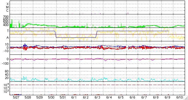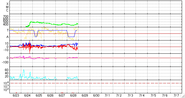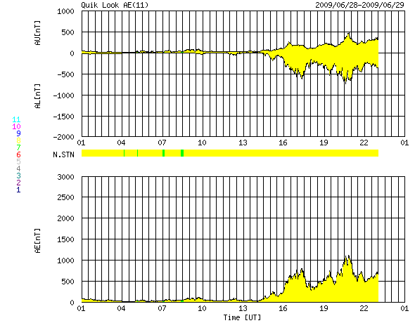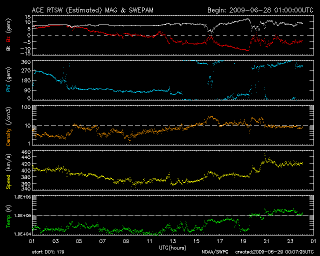 2009/ 6/29 09:08 更新 太陽風磁場が大きく南を向き、磁気圏が活動的になっています。 担当 篠原 昨日より、太陽風の磁場強度が8nT程度にやや強まっていました。 その後も、強まった傾向が続いたのですが、 昨夜より、南北成分が大きく南を向くようになりました。 今日のACEの図では、 初めの南北成分は、北にいっぱいに向いています。 それが、28日18時(世界時28日9時)頃に南に切り替わり、 以降、-5nTから最大で-10nTに達する強い南向きが続いているのです。 変化のパターンから、太陽から大きな磁場のかたまりが飛んで来たのかもしれません。 -5nTほどの南向きはまだ続いていて、もうしばらくこの状態が続くかもしれません。 この磁場の影響で、磁気圏活動が急に強まっています。 AE指数は、700〜1100nTと中規模の活動が一気に強まりました。 その変化は、シベリアの磁場データにも見えています。 一方、沖縄の磁場データには、目立った変化は見られませんでした。 世界規模のデータから作るDst指数を参照しても、大きな変化にはなっておらず、 磁気圏の赤道域に環電流(リングカレント)を作る磁気嵐には、なっていない様です。 太陽風の速度は、420km/秒と通常のレベルです。 昨夜、多少下がったりしましたが、たいした変化ではありません。 コロナホールの影響は、この程度で終わってしまうのでしょうか。 SOHO EIT195には、続くようなコロナホールは見られず、 この後は穏やかな太陽風が続きそうです。 太陽は無黒点です。 SOHO EIT195による太陽コロナ。29日7時半(世界時28日23時半)。 (c) SOHO (ESA & NASA) ![]() ACEが観測した太陽風の磁場(1番上の枠、白線は全体の強度、赤線は南北成分) および、太陽風の密度(3番目の橙線)、速度(4番目の黄線) (c) NOAA/SWPC ![]() リアルタイムAE指数 下段のAEグラフの値が高くなると、オーロラ活動が活発化しています。 (c) 京都大学, NICT ![]() シベリアで観測された3日間の磁場データ 右側の3分の1が、昨日のデータになります。グラフが上がったり下がったりすると、オーロラ活動が活発化しています。 (c) NICT ![]() 沖縄の磁場擾乱 下へ下がるほど、擾乱が発達している事を意味します。 (c) NICT ![]() 27日の太陽周期に合わせたデータプロット 太陽が同じ面を地球に向けていた27日前の変化から、今後を予想することができます。 (c) NICT