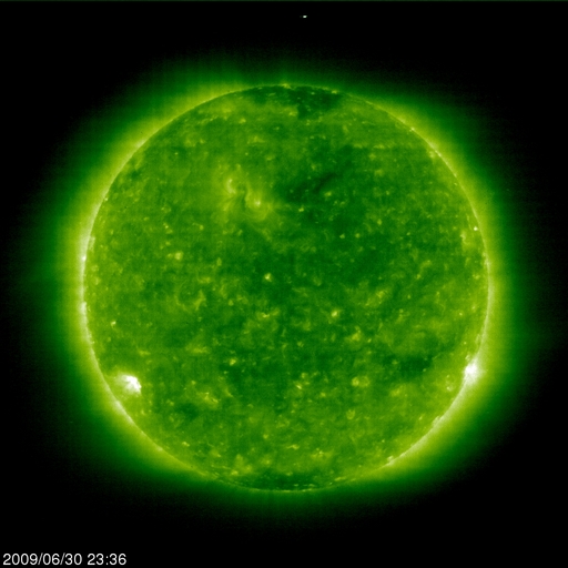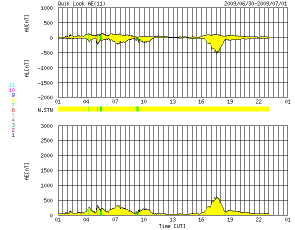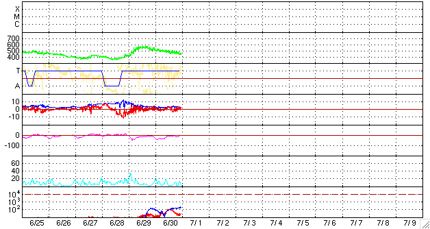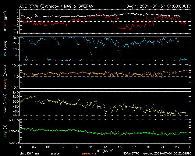 2009/ 7/ 1 09:21 更新 太陽風の速度は450km/秒に下がり、高速風は終わりつつあります。この後は静穏になるでしょう。 担当 篠原 太陽風の速度は、 昨日のニュース以降、500km/秒から450km/秒へゆっくりと下がり、 やや速いという程度になりました。 この後も下がり続け、今日いっぱいくらいで 400km/秒まで下がるのではないでしょうか。 磁場強度は、3nTとやや弱めで安定しています。 1日0時(世界時30日15時)頃に、南北成分が-4nTと多少まとまった強さの南向きになり、 その影響で、AE指数で500nTほどの中規模オーロラ活動が発生しています。 磁場の南向きは2時間ほどで終わり、磁気圏の活動もこの1回で終わっています。 太陽風は、この後低速状態に戻り、穏やかな状態がしばらく続くと見込まれます。 現時点では、太陽風の速度の高まりは、先週から今週にかけて見られた領域しかなく、 新しい高速風が発生していなければ、 これらが回帰してくるまで静穏な状態が続くことになります。 Spaceweather.comによると、太陽の南東(左下)の活動領域に、 とても小さな黒点が発生したそうです。 しかし、SOHOの写真では白斑が見えるだけで、 この黒点を見つけることはできませんでした。 いよいよ7月に入りました。 SIDCより、6月の黒点数が発表されましたら、まとめてみたいと思います。 SOHO EIT195による太陽コロナ。7月1日8時半(世界時30日23時半)。 (c) SOHO (ESA & NASA) ![]() SOHOによる太陽可視光写真。南半球の東西端に白斑が見えます。7月1日6時(世界時30日21時)。 (c) SOHO (ESA & NASA) ![]() ACEが観測した太陽風の磁場(1番上の枠、白線は全体の強度、赤線は南北成分) および、太陽風の密度(3番目の橙線)、速度(4番目の黄線) (c) NOAA/SWPC ![]() リアルタイムAE指数 下段のAEグラフの値が高くなると、オーロラ活動が活発化しています。 (c) 京都大学, NICT ![]() シベリアで観測された3日間の磁場データ 右側の3分の1が、昨日のデータになります。グラフが上がったり下がったりすると、オーロラ活動が活発化しています。 (c) NICT ![]() 27日の太陽周期に合わせたデータプロット 太陽が同じ面を地球に向けていた27日前の変化から、今後を予想することができます。 (c) NICT