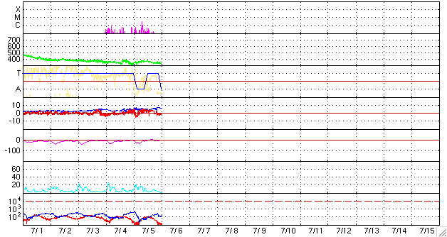 2009/ 7/ 6 09:59 更新 1024黒点群で、C2.7の小規模フレアが発生しました。Cクラスフレアは7ヶ月ぶりです。 担当 篠原 1024黒点群で、昨日、5日16時(世界時5日7時)に、 C2.7の小規模フレアが発生しました。 Cクラス以上のフレアの発生は、2008年12月11日以来と、7ヶ月ぶりのことです。 この3日間の、1024黒点群の発達の様子を動画にしました。 この大きさの黒点群も、久しぶりではないかと思います。 EIT195の動画を見ても、1024黒点群は細かく活動しています。 その様子は、GOESのX線データにも現れていて、 Cクラスのフレアの前後にも、Bクラスの変化が連続的に観測されています。 1024黒点群では、今後もCクラスのフレアが発生する可能性がありそうです。 引き続き、注目して下さい。 太陽風は、低速で穏やかな状態が続いています。 速度は、昨日より340km/秒前後で安定しています。 磁場強度は、5nT付近にあり、平均的な強さです。 磁気圏も概ね静穏です。 AE指数を見ると、最初と最後の部分に少し幅が太くなっている部分があります。 最初の変化は、太陽風磁場の南北成分が、 -5nTの南向きになっていたのが影響したのでしょう。 一方、最後の変化では、太陽風磁場の南北成分はほとんど0nT付近でしたが、 東西成分が5nTほどの幅を持って大きく振れていました。 この影響かもしれません。 SOHO EIT195では、太陽の北極から伸びるコロナホールが、 中心線に近づいて来ました。 正面に回って来ると、濃さも増して、よく見える様になりました。 高速風の発生源としては、十分な規模を持っている様ですが、 緯度が高めなので、地球への影響がどうなるか注目されます。 影響の開始は、3〜4日ほど先となるでしょう。 1024黒点群の発達の様子。Cクラスのフレアも起こしました。 (c) SOHO (ESA & NASA)、動画加工 : 宇宙天気ニュース ![]() SOHOによる、太陽可視光写真。南半球に1024黒点群が見えます。6日6時(世界時5日21時)。 (c) SOHO (ESA & NASA) ![]() SOHO EIT195による太陽コロナ。6日9時半(世界時6日0時半)。 (c) SOHO (ESA & NASA) ![]() GOES衛星の太陽X線データ (c) NOAA/SWPC ![]() ACEが観測した太陽風の磁場(1番上の枠、白線は全体の強度、赤線は南北成分) および、太陽風の密度(3番目の橙線)、速度(4番目の黄線) (c) NOAA/SWPC ![]() リアルタイムAE指数 下段のAEグラフの値が高くなると、オーロラ活動が活発化しています。 (c) 京都大学, NICT ![]() シベリアで観測された3日間の磁場データ 右側の3分の1が、昨日のデータになります。グラフが上がったり下がったりすると、オーロラ活動が活発化しています。 (c) NICT ![]() 27日の太陽周期に合わせたデータプロット 太陽が同じ面を地球に向けていた27日前の変化から、今後を予想することができます。 (c) NICT
