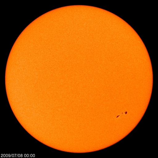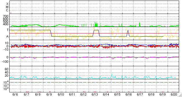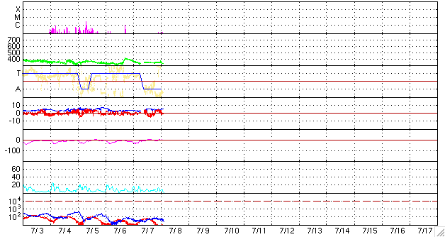 2009/ 7/ 8 12:22 更新 1024群は、黒点の規模を保っています。太陽風は低速で、磁気圏も概ね静穏です。 担当 篠原 1024黒点群は、現在もSOHOの可視光写真に大きな姿を見せていて、 黒点群の規模を保っています。 X線の強度は、昨日のニュースの頃から弱まっていたのですが、 昨夜になって再び強まって来ました。 フレアとしては、目立った変動を起こしていませんが、 引き続き注目したい領域です。 太陽風は、350km/秒と低速で安定しています。 今朝になって、320km/秒近くに下がりました。 磁場強度は、5-6nTと値としては平均的な強さですが、 昨日と比較すると少し強まっています。 コロナホールの影響が来るには、まだ少し早い様に思いますが、 太陽風のプラズマ密度も1個/cm^3から10個/cm^3に増えていて、 どういう変化か、もうしばらく注目したいところです。 磁気圏活動は、基本的には静穏ですが、 太陽風磁場が一時的に-4nTの南向きになった影響で、 AE指数に400nTの小規模活動が起きました。 その他の時間帯は、完全に平坦です。 SOHO EIT195を見ると、北極から伸びるコロナホールは、 次第に西半球に移っています。 影響開始位置(目安の位置です)まで、もう少しです。 また、東半球に、別の小さなコロナホールが見えて来ました。 規模は小さいですが、緯度がより低いので、地球へ影響は届きやすくなっています。 5日後くらいだと思います。チェックしてみましょう。 SOHOによる、太陽可視光写真。南半球西側に1024黒点群が見えます。8日9時(世界時8日0時)。 (c) SOHO (ESA & NASA)、画像加工 : 宇宙天気ニュース ![]() SOHO EIT195による、太陽コロナの様子。8日12時(世界時8日3時)。 (c) SOHO (ESA & NASA) ![]() GOES衛星の太陽X線データ (c) NOAA/SWPC ![]() ACEが観測した太陽風の磁場(1番上の枠、白線は全体の強度、赤線は南北成分) および、太陽風の密度(3番目の橙線)、速度(4番目の黄線) (c) NOAA/SWPC ![]() リアルタイムAE指数 下段のAEグラフの値が高くなると、オーロラ活動が活発化しています。 (c) 京都大学, NICT ![]() シベリアで観測された3日間の磁場データ 右側の3分の1が、昨日のデータになります。グラフが上がったり下がったりすると、オーロラ活動が活発化しています。 (c) NICT ![]() 27日の太陽周期に合わせたデータプロット 太陽が同じ面を地球に向けていた27日前の変化から、今後を予想することができます。 (c) NICT