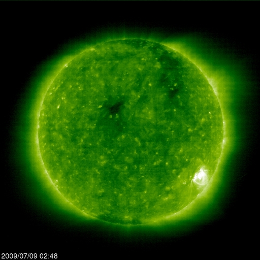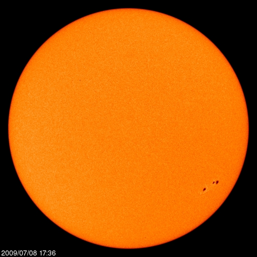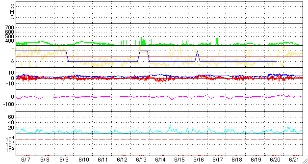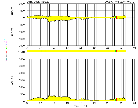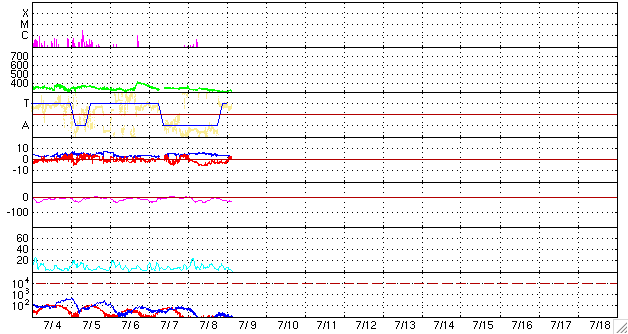 2009/ 7/ 9 12:56 更新 1024群は、大きく見えていますが、活動は穏やかです。太陽風は低速状態が続いています。 担当 篠原 1024黒点群は、太陽の西の端に近づいて来ました。 黒点の大きさは、昨日からあまり変わっていません。 しかし、X線の強度はゆっくりと下がり、活動度は弱まって来ている様です。 フレアの発生も、昨日はBクラスの小さなものが数回見られたのの、 今日に入ってからは、それ以下に弱まっています。 1024群は、このまま弱まって行くのでしょうか。 太陽風は、320km/秒ほどの低速状態が続いています。 今日は、磁場の方が面白いグラフになっています。 南北成分(赤線)が、昨日からずっと南向きになっているのです。 強度は、初めは-5nTほどで、次第に-3nTに下がり、 今朝からは北向きに変わっています。 この間に、東西成分が反転していて、太陽風のセクター境界を越えています。 南向き磁場が長く続いたため、磁気圏の対流が強まり続け、 AE指数の幅が長時間太くなるという現象が観測されています。 AE指数としては、200〜400nTくらいの小規模の変化です。 磁気圏は、活発というほどではないものの、 常にエネルギーが流れ込んでいる状態だったのです。 太陽風磁場の南向きは終わりましたので、この後は磁気圏も穏やかになるでしょう。 SOHO EIT195では、コロナホールがかなり西側に移動し、 そろそろ影響がやって来ても良い頃です。 本当に来るかどうかは、来てみないと分かりませんので、 しばらくACEのデータに注目して下さい。 SOHOによる、太陽可視光写真。南半球西側に1024黒点群が見えます。9日2時半(世界時8日17時半)。 (c) SOHO (ESA & NASA)、画像加工 : 宇宙天気ニュース ![]() SOHO EIT195による、太陽コロナの様子。9日12時(世界時9日3時)。 (c) SOHO (ESA & NASA) ![]() GOES衛星の太陽X線データ (c) NOAA/SWPC ![]() ACEが観測した太陽風の磁場(1番上の枠、白線は全体の強度、赤線は南北成分) および、太陽風の密度(3番目の橙線)、速度(4番目の黄線) (c) NOAA/SWPC ![]() リアルタイムAE指数 下段のAEグラフの値が高くなると、オーロラ活動が活発化しています。 (c) 京都大学, NICT ![]() シベリアで観測された3日間の磁場データ 右側の3分の1が、昨日のデータになります。グラフが上がったり下がったりすると、オーロラ活動が活発化しています。 (c) NICT ![]() 27日の太陽周期に合わせたデータプロット 太陽が同じ面を地球に向けていた27日前の変化から、今後を予想することができます。 (c) NICT
