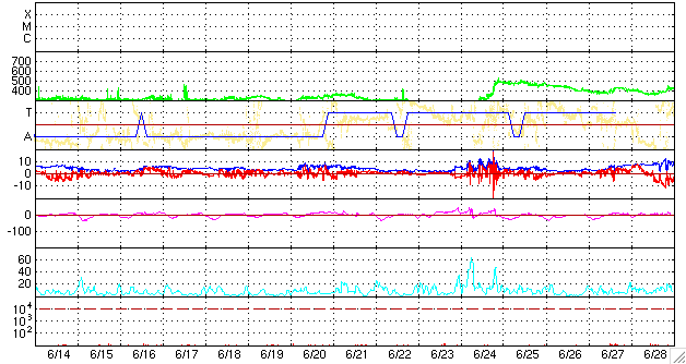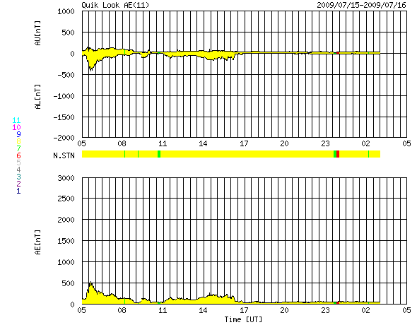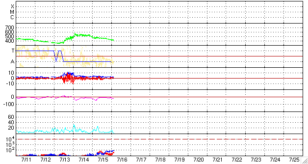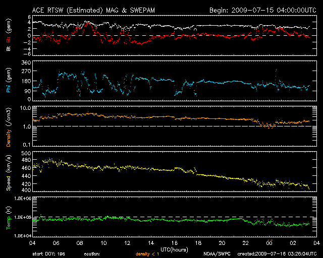 2009/ 7/16 13:12 更新 太陽風は穏やかになって来ました。これから1週間近く、静かになるでしょう。 担当 篠原 太陽風の速度(ACEの図の黄色線)はじわじわと下がり、間もなく400kmに届きそうです。 磁場強度(白線)も2nTに落ちて、太陽風は穏やかになっています。 磁気圏も概ね静穏です。 AE指数は、図の前半に小規模の変化が発生していますが、 これは、太陽風磁場の南北成分(赤線)が、-2nTと弱いながらも南向きになっていた影響です。 その後、南北成分は0nT付近に留まる様になり、 それとともに、AE指数も変化しなくなっています。 穏やかな太陽風は、この後、7月21-22日頃まで続きます。 SOHO EIT195の写真が更新されましたが、 コロナホールは太陽の東側(左側)に見えています。 今日の位置だと、太陽の中心に来るのに3日ほど、太陽風が地球に来るのに3日と、 6日後頃に影響がやって来そうだと見積もることができます。 太陽は、無黒点のままで、とても静かです。 SOHO EIT195による、太陽コロナの様子。16日13時(世界時16日4時)。 (c) SOHO (ESA & NASA) ![]() ACEが観測した太陽風の磁場(1番上の枠、白線は全体の強度、赤線は南北成分) および、太陽風の密度(3番目の橙線)、速度(4番目の黄線) (c) NOAA/SWPC ![]() リアルタイムAE指数 下段のAEグラフの値が高くなると、オーロラ活動が活発化しています。 (c) 京都大学, NICT ![]() シベリアで観測された3日間の磁場データ 右側の3分の1が、昨日のデータになります。グラフが上がったり下がったりすると、オーロラ活動が活発化しています。 (c) NICT ![]() 27日の太陽周期に合わせたデータプロット 太陽が同じ面を地球に向けていた27日前の変化から、今後を予想することができます。 (c) NICT