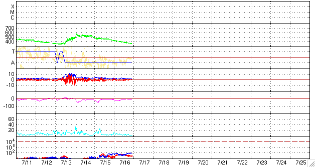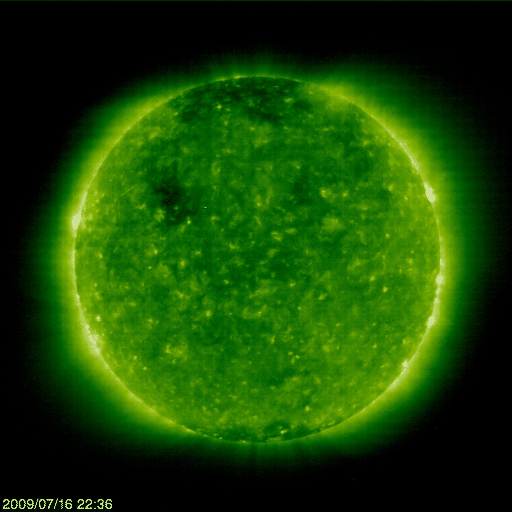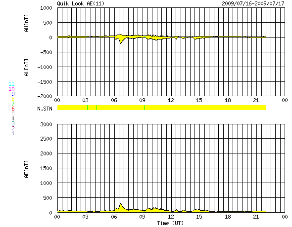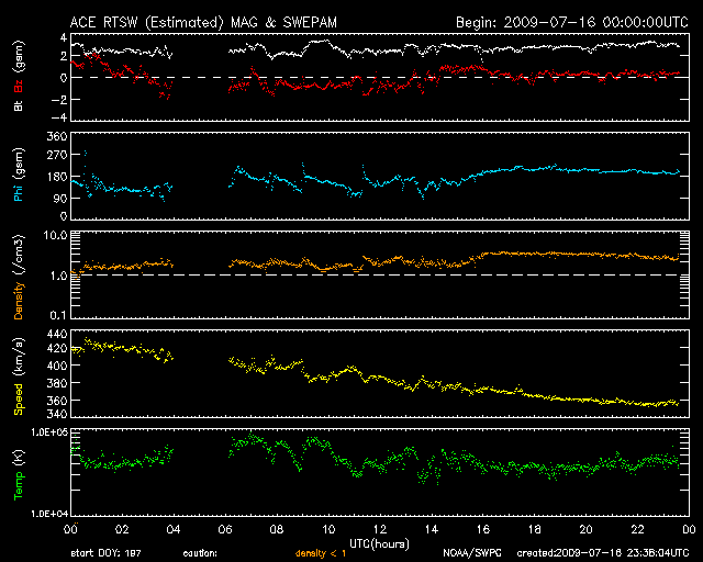 2009/ 7/17 08:38 更新 太陽風の速度は350km/秒近くに下がり、低速風になりました。磁気圏も静かです。 担当 篠原 太陽風の速度は、400km/秒を割った後も更に下がり続け、 間もなく350km/秒に達するところです。 すっかり低速太陽風になりました。 磁場強度は、3nTとやや弱めで安定してます。 磁気圏も静穏です。 AE指数はほとんど変化していません。 穏やかな状態は、これから5日間程度続くでしょう。 その後、小規模の太陽風速度の上昇が起こります。 発生源のコロナホールは、次第に太陽の中心に近づいています(SOHO EIT195)。 コロナホールが太陽の中心線に達して、3日後くらいから高速風は始まります。 SOHOの写真を見ながら、より正確な見積もりを立てて下さい。 太陽は、無黒点の状態が続いています。 すっかり穏やかになっています。 さて、7月22日の日食まであと5日となりました。 皆既日食が見られるのは、トカラ列島を中心とした狭い地域だけですが、 かなり大きな部分日食が、日本全国で見られます。 この日はぜひ、日食メガネなどを用意して部分日食を観望して下さい。 専用メガネが無ければ、木漏れ日を見たり(欠けた太陽がいっぱい映ります)、 紙に小さな穴を開けて太陽の光を地面に映したり(日付けや文字を映せます)、 小さな手鏡で太陽の光を離れた場所に投影して太陽の形を見たりと、 いろいろ工夫して楽しむことができます。 欠け方の大きい地域では、周囲が薄暗く見えて来るでしょう。 カメラの露出を固定して、撮り比べるのも面白いです。 この日は、宇宙天気で日頃お世話になっている太陽を じっくりと自分の目で眺めてください。 (直接はもちろん危険です。くれぐれも気をつけて) SOHO EIT195による、太陽コロナの様子。17日7時半(世界時16日22時半)。 (c) SOHO (ESA & NASA) ![]() ACEが観測した太陽風の磁場(1番上の枠、白線は全体の強度、赤線は南北成分) および、太陽風の密度(3番目の橙線)、速度(4番目の黄線) (c) NOAA/SWPC ![]() リアルタイムAE指数 下段のAEグラフの値が高くなると、オーロラ活動が活発化しています。 (c) 京都大学, NICT ![]() シベリアで観測された3日間の磁場データ 右側の3分の1が、昨日のデータになります。グラフが上がったり下がったりすると、オーロラ活動が活発化しています。 (c) NICT ![]() 27日の太陽周期に合わせたデータプロット 太陽が同じ面を地球に向けていた27日前の変化から、今後を予想することができます。 (c) NICT