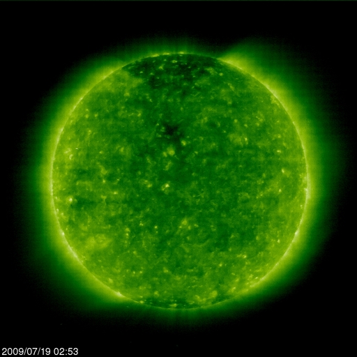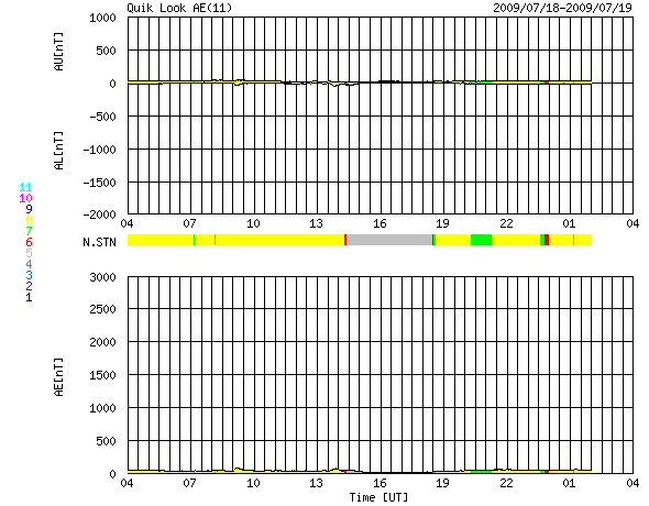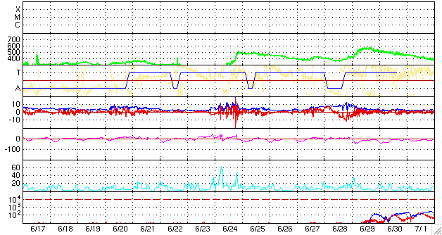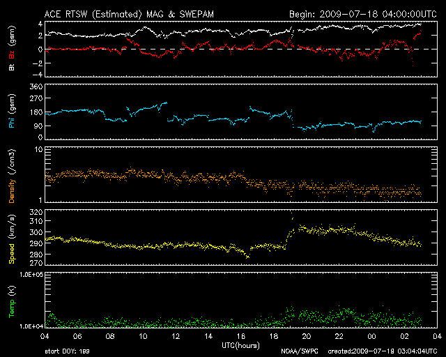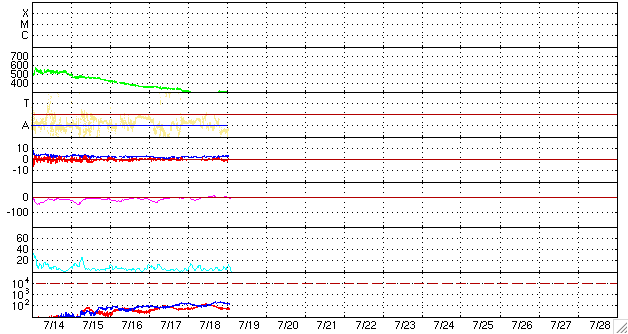 2009/ 7/19 12:05 更新 290km/秒のとても遅い太陽風が続いています。磁気圏活動もとても静かです。 担当 篠原 低速の太陽風による、穏やかな宇宙天気が続いています。 昨日、300km/秒に下がった太陽風の速度は、そのまま290km/秒付近で安定しています。 とても遅い状態です。 磁場強度も、2nTと弱まったままで安定しています。 ACEの図の最後のところで、3nTを超える程度に強まりを見せていますが、 現時点では、変化としては小さなものです。 太陽風が穏やかなため、磁気圏活動も全く静かです。 AE指数のグラフなど、データが取れていないのではと思わせるほど平坦になっています。 太陽に目を向けると、SOHO EIT195では、コロナホールがいよいよ太陽の中心線に達しています。 これから3日後くらいに太陽風の変化が始まると思われます。 22日頃でしょうか。 ただ、コロナホールはだいぶ小さいです。 むしろ、北極に広がる大きなコロナホールの方が気になります。 やって来る高速風は、前周期同様500km/秒にやっと達するくらいの変化ではないでしょうか。 太陽は無黒点が続いています。 こちらもとても静かです。 SOHO EIT195による、太陽コロナの様子。19日11時半(世界時19日2時半)。 (c) SOHO (ESA & NASA) ![]() ACEが観測した太陽風の磁場(1番上の枠、白線は全体の強度、赤線は南北成分) および、太陽風の密度(3番目の橙線)、速度(4番目の黄線) (c) NOAA/SWPC ![]() リアルタイムAE指数 下段のAEグラフの値が高くなると、オーロラ活動が活発化しています。 (c) 京都大学, NICT ![]() シベリアで観測された3日間の磁場データ 右側の3分の1が、昨日のデータになります。グラフが上がったり下がったりすると、オーロラ活動が活発化しています。 (c) NICT ![]() 27日の太陽周期に合わせたデータプロット 太陽が同じ面を地球に向けていた27日前の変化から、今後を予想することができます。 (c) NICT