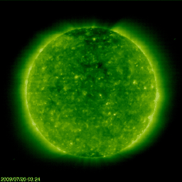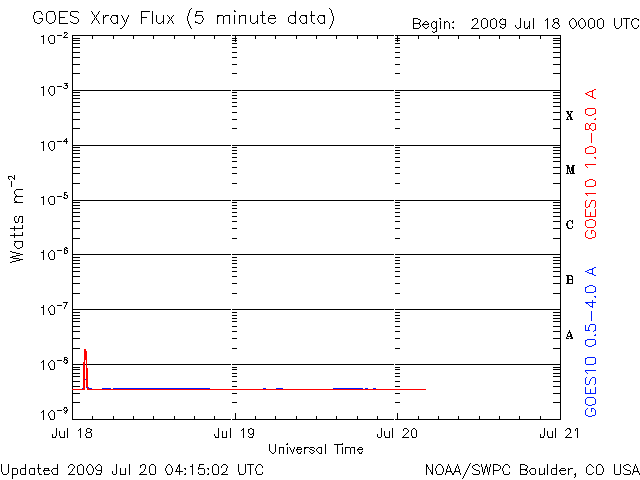 - 2009/ 7/18 10:37 太陽風の速度は更に下がり、300km/秒です。太陽は無黒点が続いています。