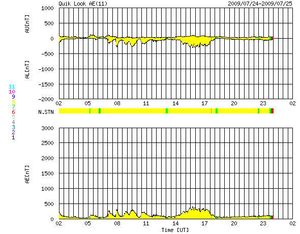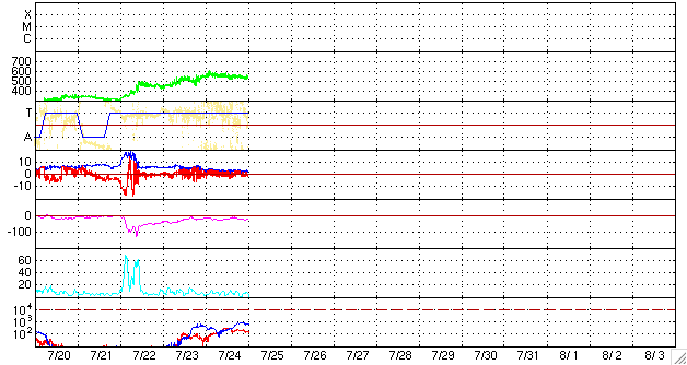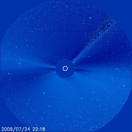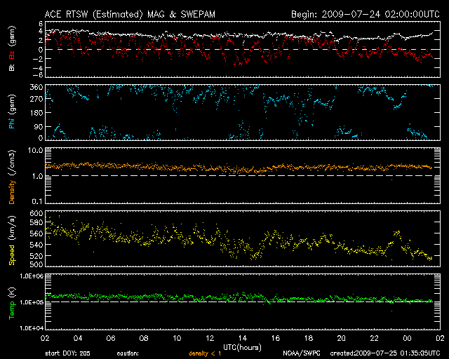2009/ 7/25 10:35 更新 太陽風は、500km/秒台の高速状態を保っています。太陽は無黒点です。 担当 篠原 SOHO LASCO C3の画面に、かに座のプレセぺ星団が見えています。 左端から3分の1ほどのところの、ごちゃごちゃとした小さな星の集まりです。 毎年、この季節になるとSOHOで見えるようになります。 星団の周囲には、やや傾いた四角形の星の並びがありますが、 かに座の甲羅にあたる部分です。 高速の太陽風が続いています。 現在も速度は540km/秒近くを保っていて、 27日周期の図で前周期の太陽風と比較すると、高速状態が長く続いています。 27日周期の予想では、今回の高速風は昨日くらいで終わって、 明日、26日からは、前周期の6月29日に発生した高速風の 回帰が見られるのではないかと考えていました。 しかし、高速状態は現在も続き、このまま次の高速風につながって行くのかもしれません。 その一方、SOHO EIT195では、 前周期に見られた太陽低緯度域のコロナホールは見えなくなっています。 発生源が弱まっているため、明日以降の高速風は弱まっているかもしれません。 明日以降どうなるのか、ACEの観測に注目して下さい。 磁気圏では、AE指数で300nTほどと小規模ですが、オーロラ活動が頻繁に見られています。 太陽風磁場は、強度3nT程度と小振幅になってしまったものの、 南北成分が+に−にと細かく変動しているためでしょう。 太陽風が現在の状態を保つと、磁気圏も同程度に変動を続けるでしょう。 一方、太陽風の速度が下がったり、磁場の南向きがあまり見られなくなる様になると、 磁気圏活動も落ち着いて行きます。 沖縄の磁場データは、少しずつ静穏レベル(青線)に戻りつつあります。 磁気嵐の状態は終息しつつあります。 放射線帯の高エネルギー電子の増加は、1000に達しない程度で止まっています。 太陽風は落ち着いて来ている事もあり、今回の増加はここまででしょう。 太陽では、昨日とても小さな黒点が見えたのですが、 一時的な発生で、現在は見えなくなっています。 NOAAの番号が付けられる事もありませんでした。 SOHOの磁場観測では、強まった部分がまだ残っています。 SOHO LASCO C3の左側に、小さな星の集まり プレセぺ星団が見えています。取り囲む四角の星は、かに座です。 (c) SOHO (ESA & NASA) ![]() SOHO EIT195による、太陽コロナの様子。25日7時半(世界時24日22時半)。 (c) SOHO (ESA & NASA) ![]() SOHOによる、太陽可視光写真。小さな黒点は見えなくなり、太陽は無黒点となっています。 (c) SOHO (ESA & NASA) ![]() SOHOによる太陽磁場。黒点があった部分の磁場の強まりは、まだ残っています。 (c) SOHO (ESA & NASA) ![]() ACEが観測した太陽風の磁場(1番上の枠、白線は全体の強度、赤線は南北成分) および、太陽風の密度(3番目の橙線)、速度(4番目の黄線) (c) NOAA/SWPC ![]() リアルタイムAE指数 下段のAEグラフの値が高くなると、オーロラ活動が活発化しています。 (c) 京都大学, NICT ![]() シベリアで観測された3日間の磁場データ 右側の3分の1が、昨日のデータになります。グラフが上がったり下がったりすると、オーロラ活動が活発化しています。 (c) NICT ![]() 沖縄の磁場擾乱 下へ下がるほど、擾乱が発達している事を意味します。 (c) NICT ![]() 27日の太陽周期に合わせたデータプロット 太陽が同じ面を地球に向けていた27日前の変化から、今後を予想することができます。 (c) NICT