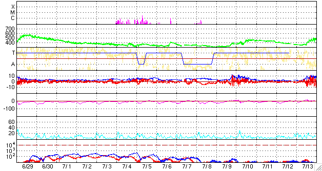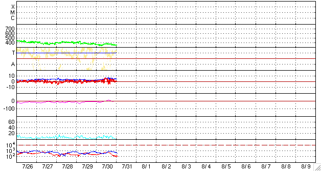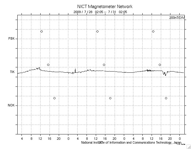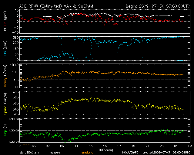 - 2009/ 7/30 13:57 太陽風の速度は350km/秒に下がり、低速風になりました。明日、速度の上昇が起きるかもしれません。