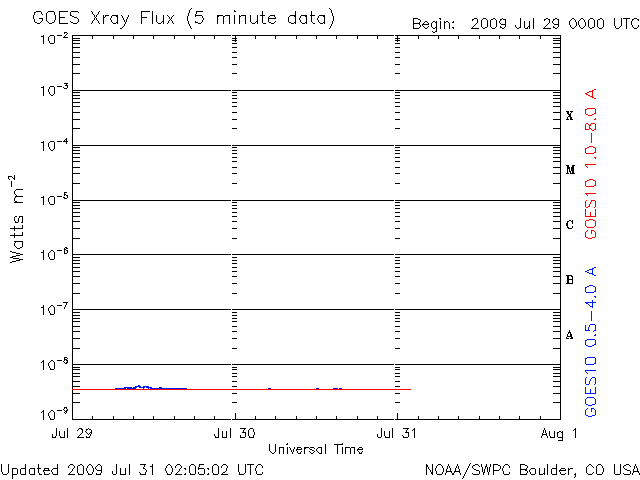 - 2009/ 7/29 10:06 400km/秒の穏やかな太陽風が続いています。太陽は無黒点が続いています。