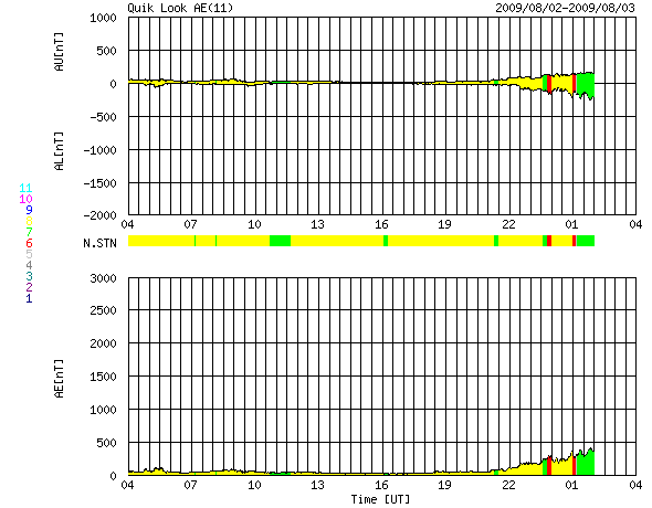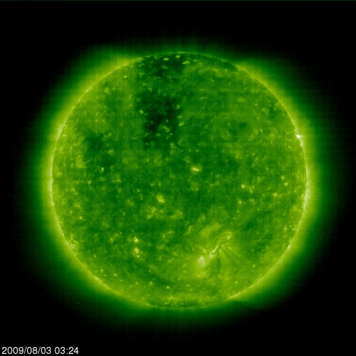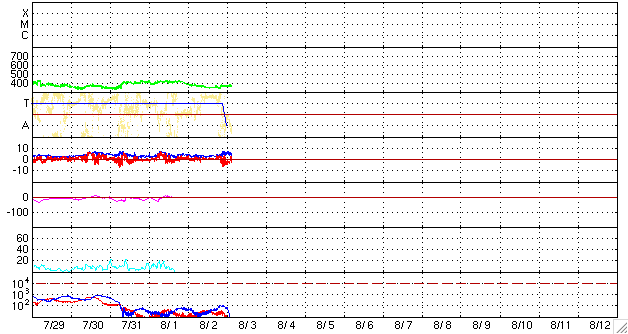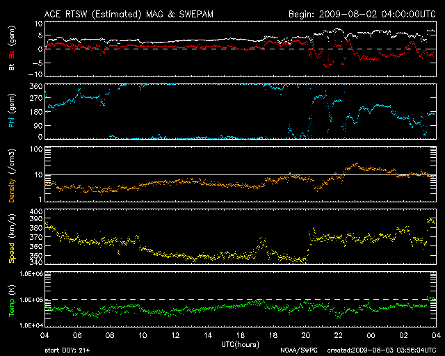 また、2006年7月以降のグラフを掲載しましたので、今日の1枚目を見て下さい。 7月は、1024黒点群が出現し、Cクラスのフレアを起こすなどして盛り上がったのですが、 結局、目立った活動はこの期間だけで、 以後は非常に静穏になり、無黒点日数も高いレベルを保つこととなりました。 グラフの傾向を見ると、ちょうど1年前の2008年7月に無黒点日数は最高レベルに到達し、 以後1年間高止まりの状態にあるように見えます。 今後、いつから無黒点の日数が減り始めるのか、 減り始めてどの程度で太陽活動が活発化するのか、などと考えると、 太陽はまだ当分の期間、静かな状態を続けることになるのかもしれません。 太陽風は、速度は370km/秒と低速風に変わって来ました。 一方、磁場強度は3nTから6nTへ、やや強まっています。 27日周期の図を見ると、ちょうどセクターの切り替わりがやって来た様で、 それに関係した変化かもしれません。 コロナホールなどは見られなかったので、速度が大きく上昇することはないと思います。 磁気圏は静穏な状態が続いています。 SOHO EIT195では、コロナホールがちょうど太陽の中心線に達しています。 3日後と見積もって、6日あたりに太陽風の変化がやって来そうです。 太陽は、今日も可視光写真がないのですが、無黒点とのことです。 X線のグラフも静穏です。 2006年7月以降の、月ごとの無黒点日数の変化。 (c) 作図 : 宇宙天気ニュース、データ : SIDC ![]() SOHO EIT195による、太陽コロナの様子。3日8時(世界時2日23時)。 (c) SOHO (ESA & NASA) ![]() ACEが観測した太陽風の磁場(1番上の枠、白線は全体の強度、赤線は南北成分) および、太陽風の密度(3番目の橙線)、速度(4番目の黄線) (c) NOAA/SWPC ![]() リアルタイムAE指数 下段のAEグラフの値が高くなると、オーロラ活動が活発化しています。 (c) 京都大学, NICT ![]() シベリアで観測された3日間の磁場データ 右側の3分の1が、昨日のデータになります。グラフが上がったり下がったりすると、オーロラ活動が活発化しています。 (c) NICT ![]() 27日の太陽周期に合わせたデータプロット 太陽が同じ面を地球に向けていた27日前の変化から、今後を予想することができます。 (c) NICT