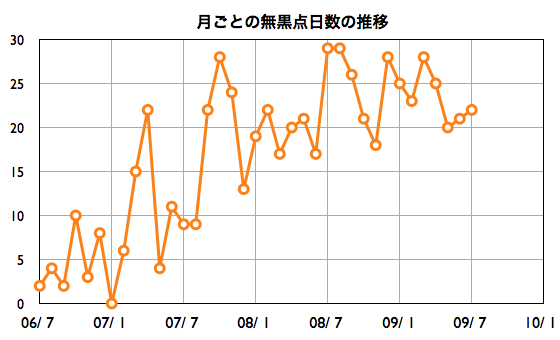 2009/ 8/ 3 12:57 更新 7月の黒点数データを含めて、無黒点日の推移をまとめました。太陽風は低速で、静穏です。 担当 篠原 昨日お知らせした様に、SIDCより、7月の黒点数データが発表されました。 それによると、7月に黒点が出現したのは、 4日〜10日(NOAAの1024群です)、23日(24日の記事参照)、30日(SOHOの写真無く、不明)の9日間で、 無黒点日の日数は22日でした。 2006年11月以降の推移を表にします。