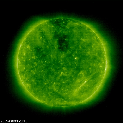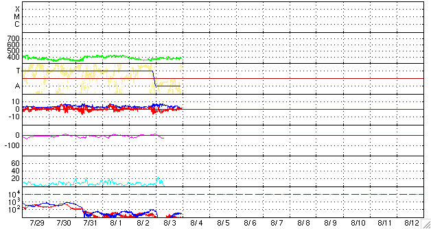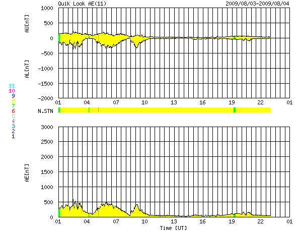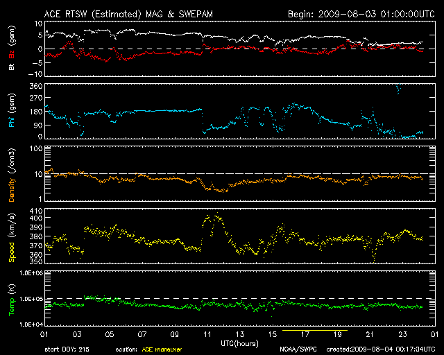 2009/ 8/ 4 09:06 更新 穏やかな太陽風が続いています。太陽も無黒点が続いています。 担当 篠原 太陽風は、速度380km/秒と、平均的な速度で安定しています。 やや高まっていた磁場強度も、次第に弱まり、現在は2nT近くに下がっています。 27日周期の図を見ると、昨日の磁場の強まりは、 太陽風磁場のセクター境界にともなう変化だった様です。 太陽風には、太陽から流れて来る磁場の方向が「太陽から地球に向かう(A)」領域と、 「地球から太陽に向かう(T)」領域とがあります。 セクター境界とは、この2つの領域の境目のことです。 磁場の方向が切り替わることそのものに特別の意味はありませんが、 セクター境界とともに高速風がやって来たり、今回の様に様子が少し変化したりということが見られます。 また、地球の磁場の向きとの関係で、オーロラ活動への影響も強まったり弱まったりします。 27日周期の図で他のデータと比べていると、なかなか面白いデータです。 磁場が強まっていた間、南北成分が-3nTほどですが南側に偏っていました。 この影響で、磁気圏では小規模のオーロラ活動が発生しています。 AE指数のグラフを見ると、前半に400nTほどの変化が記録されています。 後半は静かになっていますが、 これは、太陽風の磁場強度が弱まるとともに、南北成分も0nT付近に下がってしまったためです。 太陽風は、明日までは穏やかに過ぎて行くでしょう。 そして、6日頃から高速風がやって来る可能性があります。 発生源のコロナホールが、SOHO EIT195の太陽の中央線に見えています。 今頃、地球に向かって速度の高い風が吹き出しているのでしょう。 太陽は無黒点の状態が続いている様です。 EIT195でも、明るく光る場所は見られません。 STEREO衛星で太陽の左右を見渡しても、活動的な領域は見られません。 静かな太陽が続いています。 SOHO EIT195による、太陽コロナの様子。8月4日9時(世界時4日0時)。 (c) SOHO (ESA & NASA) ![]() ACEが観測した太陽風の磁場(1番上の枠、白線は全体の強度、赤線は南北成分) および、太陽風の密度(3番目の橙線)、速度(4番目の黄線) (c) NOAA/SWPC ![]() リアルタイムAE指数 下段のAEグラフの値が高くなると、オーロラ活動が活発化しています。 (c) 京都大学, NICT ![]() シベリアで観測された3日間の磁場データ 右側の3分の1が、昨日のデータになります。グラフが上がったり下がったりすると、オーロラ活動が活発化しています。 (c) NICT ![]() 27日の太陽周期に合わせたデータプロット 太陽が同じ面を地球に向けていた27日前の変化から、今後を予想することができます。 (c) NICT
