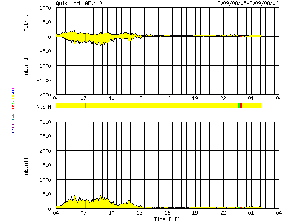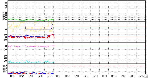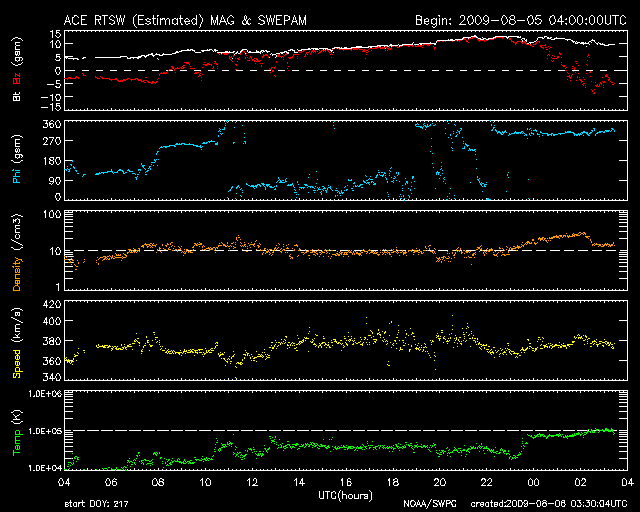 2009/ 8/ 6 12:30 更新 太陽風磁場が10nT以上に強まっています。高速風の始まりはまだです。 担当 篠原 昨夜より、太陽風の磁場がゆっくりと強まって行き、 今朝、6日5時(世界時5日22時)頃に13nTに達しました。 その後はやや下がり、現在は10nTです。 その間、太陽風の速度にはほとんど変化がなく、380km/秒で安定しています。 高速風到来の兆しかとも思われたのですが、今のところ速度に変化はありません。 磁場の南北成分を見ると、初め大きく北に偏り、 今朝になって、今度は大きく南に向かって回転しています。 この様子だと、磁場のかたまりが流れて来たのかもしれません。 (発生源は分かりませんが) 太陽風磁場の強まりに反応して、磁気圏のデータにも変化が見られます。 AE指数では、300nTほどの変化が6時間ほど連続して発生しています。 オーロラ活動によって短時間に激しく変化するのとは違うタイプの変化です。 現在、太陽風磁場の南北成分は、南向きになろうとしています。 磁気圏への影響も、今後一段と強まる可能性があります。 引き続き、ACEのデータに注目して下さい。 この後、高速風も始まる可能性があります。 SOHOは、EITもお休みに入った様です。 今日はSTEREO Behindの太陽コロナ写真を掲載します。 地球より3日半ほど先の太陽を見ています。 既にコロナホールは見えなくなっていて、 なんにもないぼんやりした太陽です。 その太陽は、今日も無黒点とのことで、静穏です。 STEREO Behindによる太陽コロナ。地球よりも3日半ほど先の太陽を見ています。6日12時(世界時6日3時) (c) NASA ![]() ACEが観測した太陽風の磁場(1番上の枠、白線は全体の強度、赤線は南北成分) および、太陽風の密度(3番目の橙線)、速度(4番目の黄線) (c) NOAA/SWPC ![]() リアルタイムAE指数 下段のAEグラフの値が高くなると、オーロラ活動が活発化しています。 (c) 京都大学, NICT ![]() シベリアで観測された3日間の磁場データ 右側の3分の1が、昨日のデータになります。グラフが上がったり下がったりすると、オーロラ活動が活発化しています。 (c) NICT ![]() 27日の太陽周期に合わせたデータプロット 太陽が同じ面を地球に向けていた27日前の変化から、今後を予想することができます。 (c) NICT