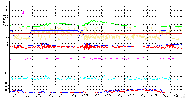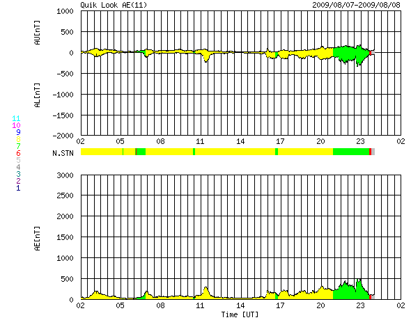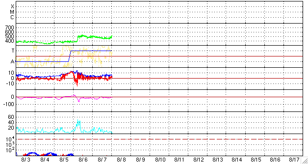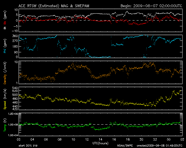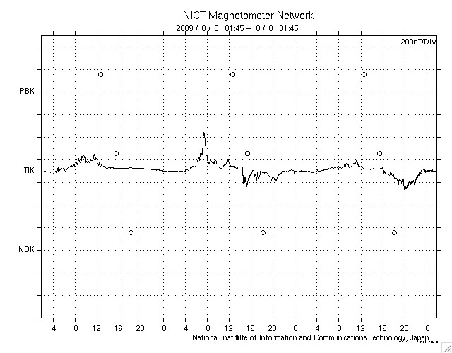 2009/ 8/ 8 10:46 更新 500km/秒付近の高速風が続いています。もうしばらく続きそうです。 担当 篠原 太陽風は、450〜500km/秒とやや高めの速度が続いています。 昨夜は下がり気味だったのですが、今朝に入って再び500km/秒へ上がっています。 磁場強度を見ると、6nTくらいの強度が続いています。 強さとしては平均的な値ですが、 高速風の終わりでは、3nT近くまで弱まっていることが多いのです。 従って、高速状態はもうしばらく続くように思われます。 磁気圏は概ね静穏ですが、 AEの図の後半に、小規模の変化が目立っています。 ACEの図で、太陽風磁場が南寄りになっていた時間帯の様です。 高速風が続けば、今後もこの程度の活動が発生する可能性があります。 実際に強まるかどうかは、太陽風磁場が南を向くか、北を向くかによって決まります。 ACEの図の速度のグラフ(黄色線)とともに、 磁場南北成分(赤線)が南向き(マイナス)になるかどうかに注目して下さい。 STEREO Behindの太陽コロナを見ると、全体的にぼんやりとしていて、 コロナホールや活動領域は見られません。 基本的には、今後の太陽風も穏やかな傾向になるでしょう。 太陽は無黒点が続いています。 とても静かです。 NOAAの番号がついた黒点を考えると、 先月上旬の1024群が最後なので、 もう1ヶ月近く目立った黒点は出ていないことになります。 (短時間の小さな黒点だと、8月30日に発生していたようです) STEREO Behindによる太陽コロナ。地球よりも3日半ほど先の太陽を見ています。8日10時(世界時8日1時) (c) NASA ![]() ACEが観測した太陽風の磁場(1番上の枠、白線は全体の強度、赤線は南北成分) および、太陽風の密度(3番目の橙線)、速度(4番目の黄線) (c) NOAA/SWPC ![]() リアルタイムAE指数 下段のAEグラフの値が高くなると、オーロラ活動が活発化しています。 (c) 京都大学, NICT ![]() シベリアで観測された3日間の磁場データ 右側の3分の1が、昨日のデータになります。グラフが上がったり下がったりすると、オーロラ活動が活発化しています。 (c) NICT ![]() 27日の太陽周期に合わせたデータプロット 太陽が同じ面を地球に向けていた27日前の変化から、今後を予想することができます。 (c) NICT