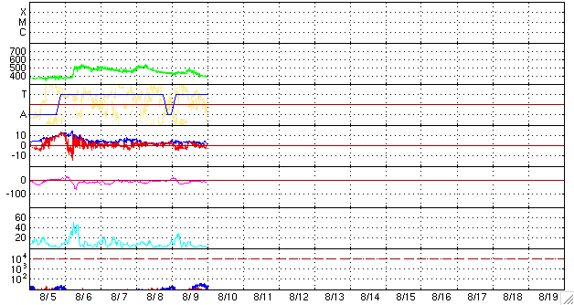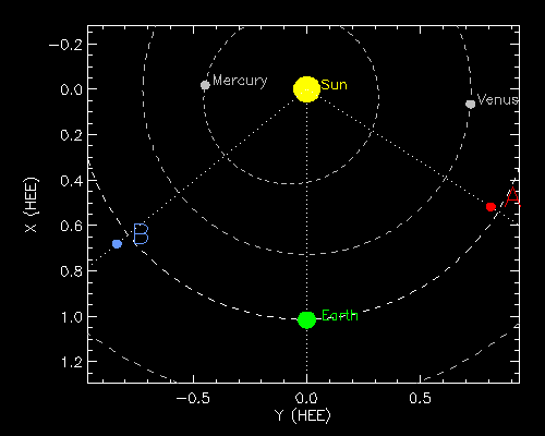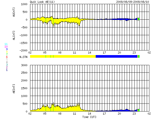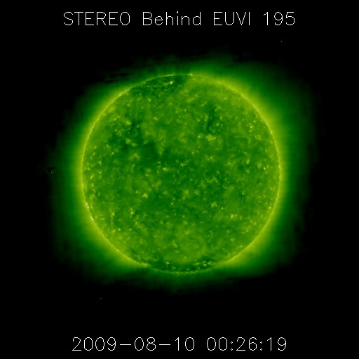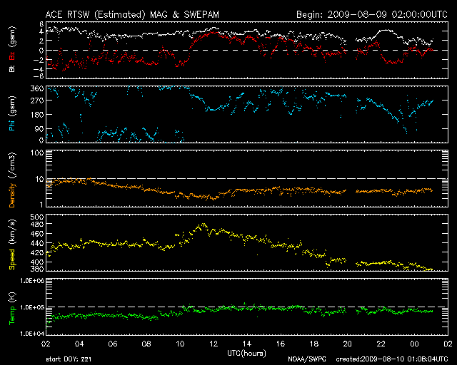 2009/ 8/10 10:09 更新 400km/秒の穏やかな太陽風が続いています。太陽は無黒点が続いています。 担当 篠原 太陽風は、400km/秒前後の穏やかな速度が続いています。 磁場強度も3-4nTと、やや弱めの状態が続いています。 磁場の南北成分を見ると、前半部に-3nTと南向きが続いた時間帯があります。 この影響で、AE指数に300〜500nTほどの小規模の変化が発生しています。 太陽風磁場の南寄り傾向が終わるとともに(図の後半)、 AE指数の変化も終わっています。 27日周期の図を見ると、今日あたりに高速風領域が回帰する可能性があります。 今のところ、ACEのデータにその気配はなく、 遅れているのか、今周期は消えてしまっているのかもしれません。 もうしばらく様子を見て下さい。 変化は、やってきても2日程度で終わるでしょう。 その後は、1週間程穏やかな太陽風が続きます。 そして、8月18日くらいから次の高速風が始まりそうです。 発生源のコロナホールが、STEREO Behindの写真の北半球東寄り(左上)に見えています。 明日には、もっとはっきりと見える様になるでしょう。 STEREO Behindは、地球よりも3日半くらい先の太陽を見ていることになります。 (現在の衛星の位置の図を2枚目に掲載します) 掲載の写真では、コロナホールは太陽の中心線に近づきつつありますが、 地球から見ると、この状態はまだ4日近く先のことです。 太陽は無黒点とのことです。 2機のSTEREOの画像を見ても、明るい領域は全くありません。 今月も無黒点の日が多くなりそうです。 STEREO Behindによる太陽コロナ。地球よりも3日半ほど先の太陽を見ています。10日9時半(世界時10日0時半) (c) NASA ![]() 現在のSTEREO衛星の位置。A衛星は地球から57度先に(4.25日遅れの太陽を)、B衛星は50度ほど後ろにいます(3.75日先の太陽を見ている)。 (c) NASA ![]() ACEが観測した太陽風の磁場(1番上の枠、白線は全体の強度、赤線は南北成分) および、太陽風の密度(3番目の橙線)、速度(4番目の黄線) (c) NOAA/SWPC ![]() リアルタイムAE指数 下段のAEグラフの値が高くなると、オーロラ活動が活発化しています。 (c) 京都大学, NICT ![]() シベリアで観測された3日間の磁場データ 右側の3分の1が、昨日のデータになります。グラフが上がったり下がったりすると、オーロラ活動が活発化しています。 (c) NICT ![]() 27日の太陽周期に合わせたデータプロット 太陽が同じ面を地球に向けていた27日前の変化から、今後を予想することができます。 (c) NICT