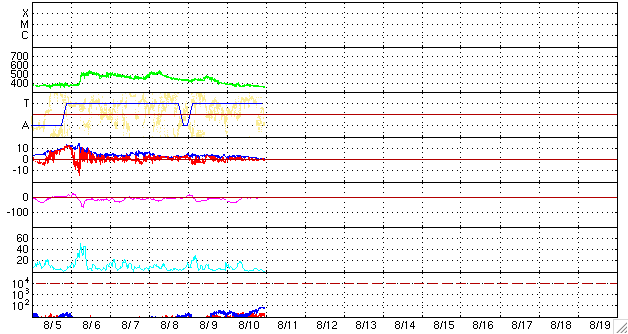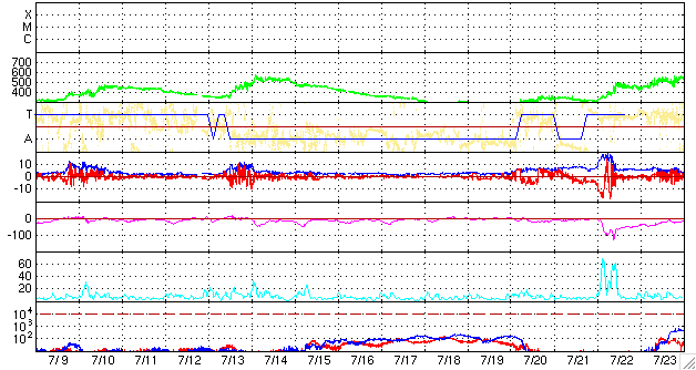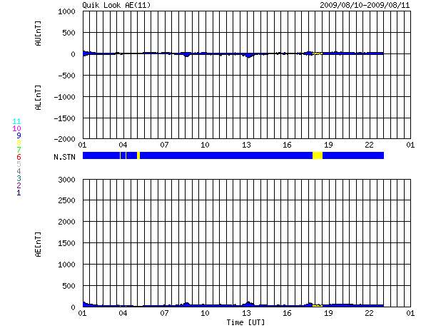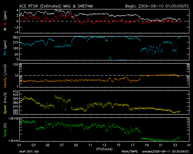 2009/ 8/11 09:26 更新 太陽風は低速になり、磁気圏もたいへん静かです。これから1週間程度、静かに過ぎて行きそうです。 担当 篠原 太陽風の速度は、360km/秒へと下がり、すっかり低速風になっています。 前周期に見られた速度の高まりは、今周期は消えていました。 磁気圏活動もたいへん穏やかです。 AE指数のグラフには全く変化がありません。 これから、1週間程度穏やかな状態が続くと予想されます。 27日周期の図によると、前周期の次の太陽風の乱れは、7月22日。 今周期は、8月18日に相当します。 STEREO Behindの太陽コロナ写真を見ると、太陽の中心から北東寄り(左上)に、 細長い裂け目のようなコロナホールがあります。 これが発生源のコロナホールです。 ただ、前周期は、もっと丸い穴のように広がりがあったのですが、 今回は規模が小さくなってしまったのかもしれません。 太陽風がどうなっているのか興味が持たれますが、 まだ、1週間ほど先のことです。 太陽は依然、無黒点が続いています。 本当に静かです。 STEREO Behindによる太陽コロナ。地球よりも3日半ほど先の太陽を見ています。11日5時(世界時10日20時) (c) NASA ![]() ACEが観測した太陽風の磁場(1番上の枠、白線は全体の強度、赤線は南北成分) および、太陽風の密度(3番目の橙線)、速度(4番目の黄線) (c) NOAA/SWPC ![]() リアルタイムAE指数 下段のAEグラフの値が高くなると、オーロラ活動が活発化しています。 (c) 京都大学, NICT ![]() シベリアで観測された3日間の磁場データ 右側の3分の1が、昨日のデータになります。グラフが上がったり下がったりすると、オーロラ活動が活発化しています。 (c) NICT ![]() 27日の太陽周期に合わせたデータプロット 太陽が同じ面を地球に向けていた27日前の変化から、今後を予想することができます。 (c) NICT