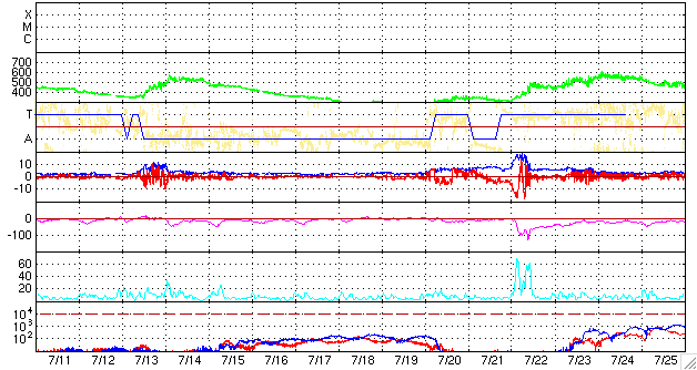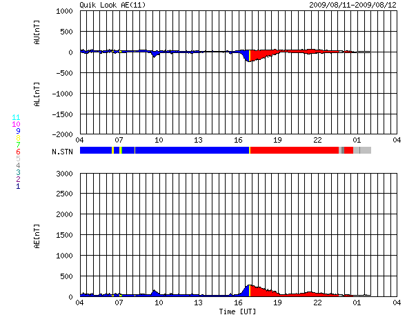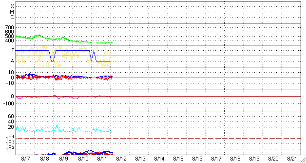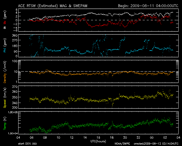 2009/ 8/12 12:15 更新 速度350km/秒の穏やかな太陽風が続いています。低速風は6日くらいは続くでしょう。 担当 篠原 低速の穏やかな太陽風が続いています。 速度は、昨日から350km/秒で安定しています。 磁場強度は、3nT前後でやや弱めです。 磁気圏も概ね静穏です。 昨夜、太陽風の磁場が6時間ほど南寄りになった影響で、 300nTほどの小さなオーロラ活動が、AE指数に記録されています。 これ以外は全く平坦です。 穏やかな太陽風は、このまま17日までは続くでしょう。 STEREO Behindの太陽コロナ写真では、北半球に見えるコロナホールが、 太陽の中心線に達しています。 しかし、コロナホールはかなり淡く、 この様子では、高速風の影響は一段と小さくなりそうです。 18,19日頃に影響が始まると予想しています。 太陽も静穏です。 X線のグラフには全く変化がなく、黒点も見られないそうです。 STEREO衛星のコロナ写真では、Behind、Aheadともに明るい領域は見られません。 STEREO Behindによる太陽コロナ。地球よりも3日半ほど先の太陽を見ています。12日5時(世界時11日20時) (c) NASA ![]() ACEが観測した太陽風の磁場(1番上の枠、白線は全体の強度、赤線は南北成分) および、太陽風の密度(3番目の橙線)、速度(4番目の黄線) (c) NOAA/SWPC ![]() リアルタイムAE指数 下段のAEグラフの値が高くなると、オーロラ活動が活発化しています。 (c) 京都大学, NICT ![]() シベリアで観測された3日間の磁場データ 右側の3分の1が、昨日のデータになります。グラフが上がったり下がったりすると、オーロラ活動が活発化しています。 (c) NICT ![]() 27日の太陽周期に合わせたデータプロット 太陽が同じ面を地球に向けていた27日前の変化から、今後を予想することができます。 (c) NICT