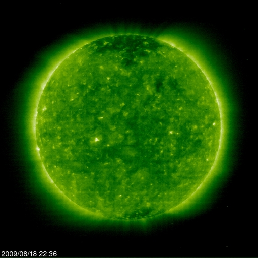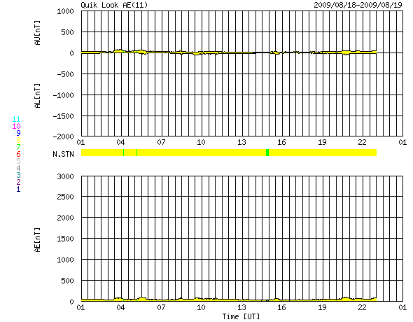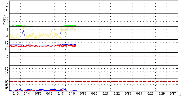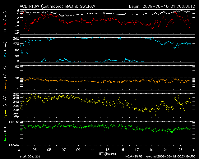2009/ 8/19 09:25 更新 太陽風は、速度350km/秒と低速状態が続いています。磁気圏はとても静かです。 担当 篠原 太陽風の速度は、340〜350km/秒に上がった程度で、高速風には変わっていません。 磁場強度も、5nTと平均的な強さで落ち着いています。 高速風の到来は遅れているのかもしれません。 今日いっぱいは様子を見る必要があります。 今のところ、太陽風の磁場強度は特に強まってはいないので、 高速風領域は、前周期と比べて弱まっているのかもしれません。 もうしばらくACEのデータに注目して下さい。 磁気圏は静穏です。 AE指数は全く変化していません。 今日は全部黄色のグラフになっています。 色が戻ってくると、少し安心しますね。 SOHO衛星の可視光太陽写真が、更新を再開しています。 しかしながら、今日も黒点は見えません。 SOHO EIT195を見ると、太陽の中心やや東(左)に小さな明るい点ができています。 もう少し発達して、黒点の発生となるかどうか。 ちょっと期待して見ていましょう。 SOHO EIT195による、太陽コロナの様子。19日7時半(世界時18日22時半)。 (c) SOHO (ESA & NASA) ![]() SOHOによる太陽の可視光写真。黒点はありません。19日7時半(世界時18日22時半)。 (c) SOHO (ESA & NASA) ![]() ACEが観測した太陽風の磁場(1番上の枠、白線は全体の強度、赤線は南北成分) および、太陽風の密度(3番目の橙線)、速度(4番目の黄線) (c) NOAA/SWPC ![]() リアルタイムAE指数 下段のAEグラフの値が高くなると、オーロラ活動が活発化しています。 (c) 京都大学, NICT ![]() シベリアで観測された3日間の磁場データ 右側の3分の1が、昨日のデータになります。グラフが上がったり下がったりすると、オーロラ活動が活発化しています。 (c) NICT ![]() 27日の太陽周期に合わせたデータプロット 太陽が同じ面を地球に向けていた27日前の変化から、今後を予想することができます。 (c) NICT