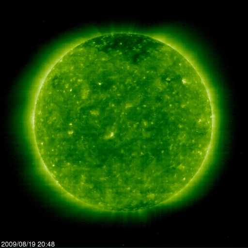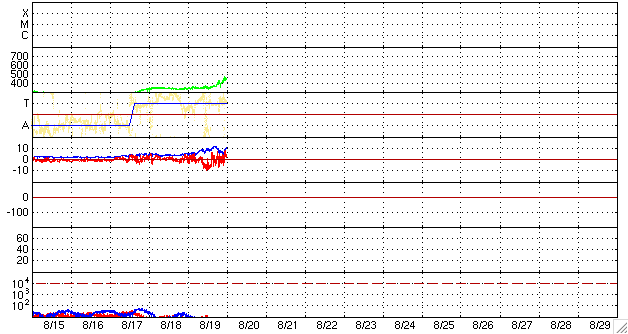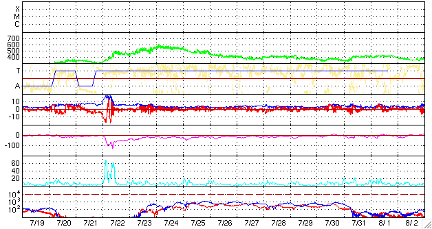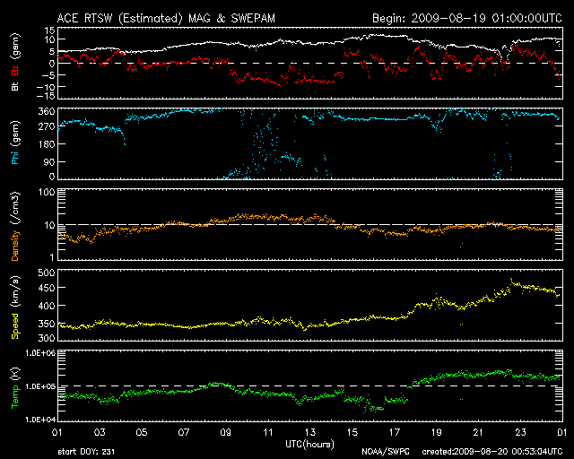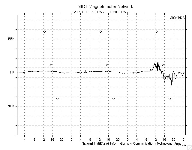 2009/ 8/20 09:53 更新 太陽風の磁場強度が10nTに強まり、磁気圏活動を高めています。また、速度が450km/秒に上がりました。 担当 篠原 前周期よりも1日半遅れで、太陽風に変化がやって来た様です。 昨夜くらいから、太陽風の磁場が10nTに強まり、速度上昇の兆しを見せていました。 そして、今朝になって、ようやく速度に変化が始まり、 今のところ、450km/秒まで速度が上がっています。 太陽風の磁場強度は、依然10nTを保っており、 引き続いて速度が上昇する可能性は高いです。 その一方、速度の上がり方に勢いが感じられないのも確かで、 コロナホールからの影響の遅れが示す様に、 高速風の規模は小さくなっているのかもしれません。 引き続き、太陽風の変化に注目して下さい。 太陽風磁場が強まって、-8nTと大きく南を向く時間帯がありました。 その頃に磁気圏活動が活発になりました。 AE指数で、600nTほどの中規模の変化が6時間にわたって連続して発生しています。 その後、磁場がやや北寄りになり、磁気圏活動も落ち着き気味になっていますが、 再び磁場が南寄りになると、速度が上がっている分、影響もより強くなります。 今日、明日と注意が必要でしょう。 高速風は、規模としては2〜3日程度のことと思われます。 SOHO EIT195では、コロナホールはもうほとんど見えなくなっています。 太陽は無黒点です。 SOHO EIT195による、太陽コロナの様子。20日6時(世界時19日21時)。 (c) SOHO (ESA & NASA) ![]() SOHO MDIによる、太陽可視光写真。今日も黒点はありません。20日6時(世界時19日21時)。 (c) SOHO (ESA & NASA) ![]() ACEが観測した太陽風の磁場(1番上の枠、白線は全体の強度、赤線は南北成分) および、太陽風の密度(3番目の橙線)、速度(4番目の黄線) (c) NOAA/SWPC ![]() リアルタイムAE指数 下段のAEグラフの値が高くなると、オーロラ活動が活発化しています。 (c) 京都大学, NICT ![]() シベリアで観測された3日間の磁場データ 右側の3分の1が、昨日のデータになります。グラフが上がったり下がったりすると、オーロラ活動が活発化しています。 (c) NICT ![]() 27日の太陽周期に合わせたデータプロット 太陽が同じ面を地球に向けていた27日前の変化から、今後を予想することができます。 (c) NICT