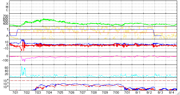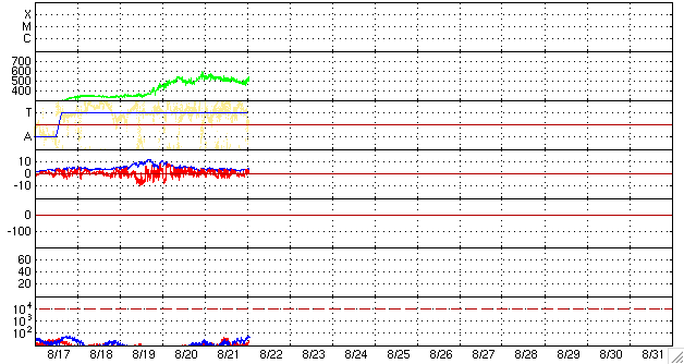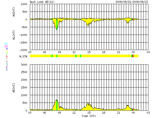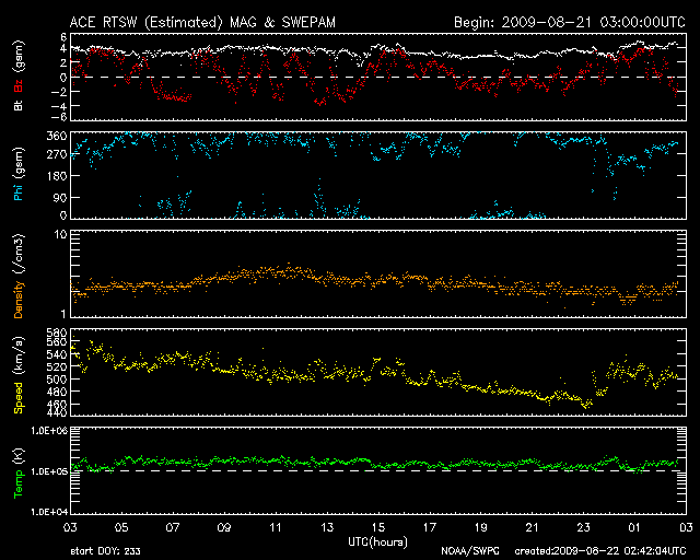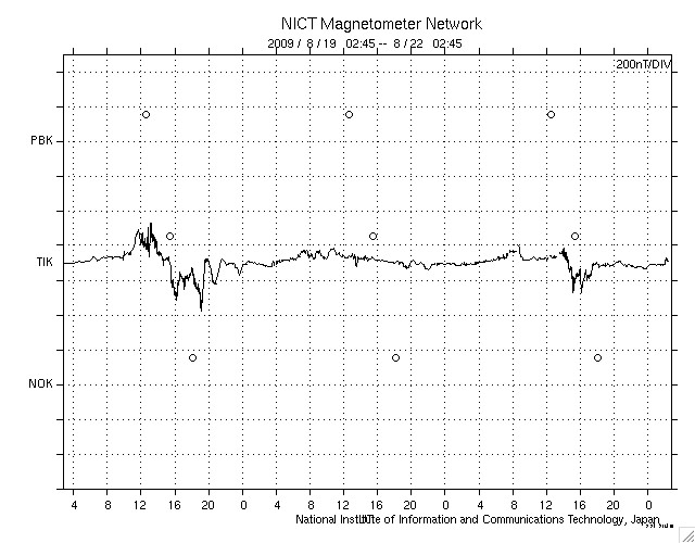 2009/ 8/22 11:42 更新 500km/秒付近の高速風が続いています。中規模のオーロラ活動も発生しています。 担当 篠原 太陽風の速度は、下がりつつありますが、まだ500km/秒台を保っています。 磁場強度は、4nTへやや戻したところで安定しています。 高速風は、基本的には終盤に向かっていると思われますが、 今日も高速状態を保つのか、400km/秒台中盤くらいへ下がって行くのか、 興味深いところです。 AE指数を見ると、700nT、500nTと中規模のオーロラ活動が発生しています。 磁場強度は4nTレベルと既に弱めだったのですが、 南北成分が、それいっぱいに-4nTの南向きになったことが影響したのでしょう。 SOHO EIT195では、太陽コロナは、全体的にぼんやりとしてます。 今回の高速風の後は、穏やかな太陽風が長く続くでしょう。 可視光の太陽も、無黒点のままです。 STEREOの写真を見ても、目立った明るい領域はありません。 無黒点のまま、8月を乗り切ってしまうのでしょうか。 SOHO EIT195による、太陽コロナの様子。22日9時(世界時22日0時)。 (c) SOHO (ESA & NASA) ![]() SOHOによる、太陽可視光写真。無黒点が続いています。22日9時(世界時22日0時)。 (c) SOHO (ESA & NASA) ![]() ACEが観測した太陽風の磁場(1番上の枠、白線は全体の強度、赤線は南北成分) および、太陽風の密度(3番目の橙線)、速度(4番目の黄線) (c) NOAA/SWPC ![]() リアルタイムAE指数 下段のAEグラフの値が高くなると、オーロラ活動が活発化しています。 (c) 京都大学, NICT ![]() シベリアで観測された3日間の磁場データ 右側の3分の1が、昨日のデータになります。グラフが上がったり下がったりすると、オーロラ活動が活発化しています。 (c) NICT ![]() 27日の太陽周期に合わせたデータプロット 太陽が同じ面を地球に向けていた27日前の変化から、今後を予想することができます。 (c) NICT