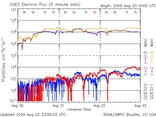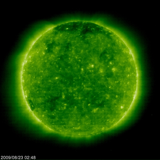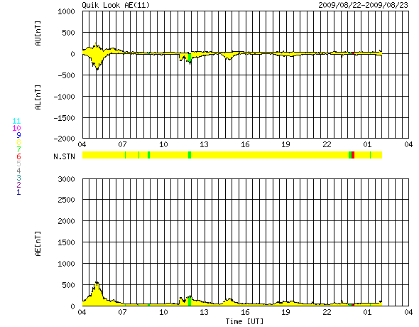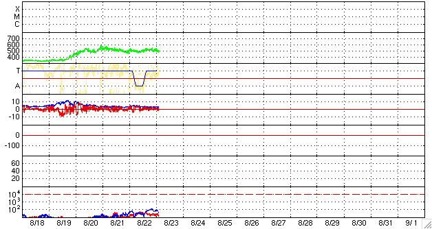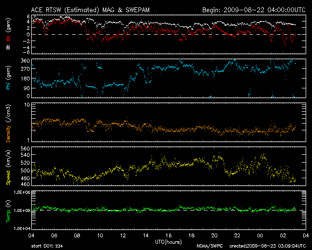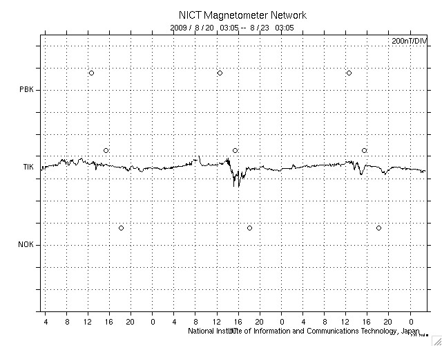 2009/ 8/23 12:06 更新 太陽風の速度は500km/秒を保ち、高速状態が続いています。磁気圏は、概ね静穏です。 担当 篠原 太陽風は、昨日から現在まで速度500km/秒を保ち、高速状態が続いています。 27日周期の図によると、今周期、高速風領域は期間全体が1日半ほど遅れただけで、 規模は同じレベルを保っていたと言えます。 現在、磁場強度は3nTへ弱まっています。 従って、これから太陽風の速度は低下に向かうと思われます。 すると、明日には高速風領域を抜け出すのではないでしょうか。 磁気圏は概ね静穏です。 AE指数は、最初に500nTの中規模変動が見られますが、 以降は小さな変化が度々見られる程度です。 太陽風の速度は高い状態が続いていますが、 磁場強度が弱まり、更に、南北成分が北寄りになってしまったためでしょう。 今後は、速度も下がって行くと思われますので、 磁気圏も穏やかな状態が続くでしょう。 この高速風を抜け出すと、しばらく穏やかな太陽風が続きます。 次の速度の山は、27日周期の図にはまだ見えていませんが、 前周期8月6日の回帰で、9月2日頃と見込まれます。 10日ほど先のことです。 一方、STEREOの太陽コロナを見ると、 南半球側に前周期はそれほど目立たなかった 小さなコロナホールが見えています。 SOHO EIT195でも一部が見え始めています。 もう3日ほどすると、よく分かる様になるでしょう。 こちらの影響で、前周期はなかった速度の高まりが、 1週間後くらいにやって来るかもしれません。 太陽は無黒点です。 SOHO EIT195による、太陽コロナの様子。23日12時(世界時23日3時)。 (c) SOHO (ESA & NASA) ![]() ACEが観測した太陽風の磁場(1番上の枠、白線は全体の強度、赤線は南北成分) および、太陽風の密度(3番目の橙線)、速度(4番目の黄線) (c) NOAA/SWPC ![]() リアルタイムAE指数 下段のAEグラフの値が高くなると、オーロラ活動が活発化しています。 (c) 京都大学, NICT ![]() シベリアで観測された3日間の磁場データ 右側の3分の1が、昨日のデータになります。グラフが上がったり下がったりすると、オーロラ活動が活発化しています。 (c) NICT ![]() 27日の太陽周期に合わせたデータプロット 太陽が同じ面を地球に向けていた27日前の変化から、今後を予想することができます。 (c) NICT