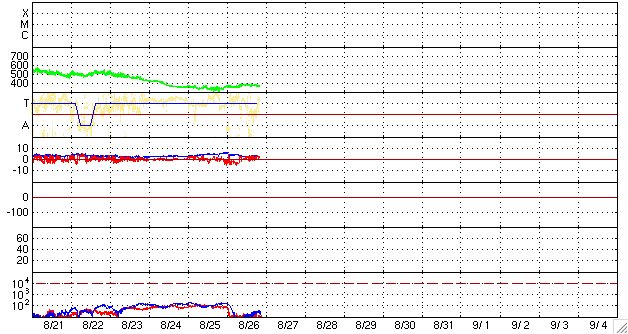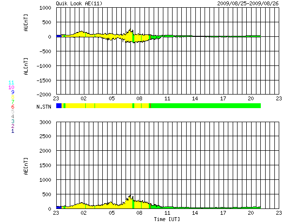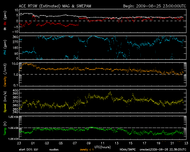 2009/ 8/27 07:38 更新 とても小さな黒点が出現しているようです。太陽風は、300km/秒台後半の穏やかな状態が続いています。 担当 篠原 太陽に、非常に微かに黒点が見えている様です。 可視光写真で、太陽の中心から少し左下に下がったところです。 ほんとうにかすかに、黒くなった部分が見えます。 と言っても、ほぼ見つからないでしょうから、2枚目の磁場写真と見比べて下さい。 こちらでは、小さく磁場が強まった領域がはっきりと見えています。 この大きさでは、黒点の出現は短時間でしょう。 NOAAやSIDCで黒点としてカウントされるかどうか、注目しています。 磁場の極性は、24期の性質です。 もう、現れる黒点はすっかり新しい周期に切り替わっています。 数が増えないだけです。 太陽風は、低速風が続いています。 速度は、350km/秒から370km/秒へわずかに上がっています。 磁場強度は、5nTから3nTへ下がりました。 昨夕、26日17時(世界時26日8時)までは、南北成分が-3nTほどの南向きがずっと続いていて、 その影響で、AE指数が小規模ながらも盛り上がった状態が続いていました。 この様なときは、磁気圏全体の対流が強まっていたと考えられます。 今後の太陽風は、SOHO EIT195の南北中緯度側に見られる小さなコロナホールの影響が 地球へやってくるかどうかです。 今日は低速のまま推移すると思われますが、明日以降に速度の高まりなどが見られるかもしれません。 SOHOによる太陽の可視光写真。中心部の左下に微かに黒点が見えます。27日6時半(世界時26日21時半)。 (c) SOHO (ESA & NASA) ![]() SOHOによる太陽の磁場写真。中心部の左下に小さな磁場の強まりがあります。27日4時(世界時26日19時) (c) SOHO (ESA & NASA) ![]() SOHO EIT195による、太陽コロナの様子。27日7時半(世界時26日22時半)。 (c) SOHO (ESA & NASA) ![]() ACEが観測した太陽風の磁場(1番上の枠、白線は全体の強度、赤線は南北成分) および、太陽風の密度(3番目の橙線)、速度(4番目の黄線) (c) NOAA/SWPC ![]() リアルタイムAE指数 下段のAEグラフの値が高くなると、オーロラ活動が活発化しています。 (c) 京都大学, NICT ![]() シベリアで観測された3日間の磁場データ 右側の3分の1が、昨日のデータになります。グラフが上がったり下がったりすると、オーロラ活動が活発化しています。 (c) NICT ![]() 27日の太陽周期に合わせたデータプロット 太陽が同じ面を地球に向けていた27日前の変化から、今後を予想することができます。 (c) NICT