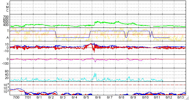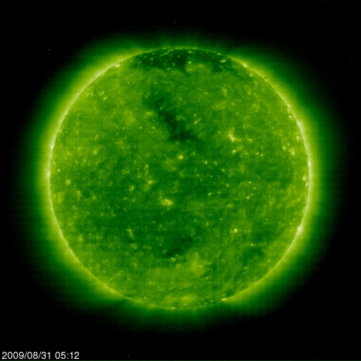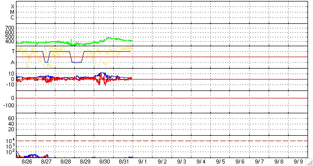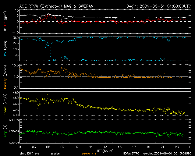 2009/ 9/ 1 09:13 更新 太陽風の速度は420km/秒に下がっています。磁気圏は比較的穏やかです。 担当 篠原 太陽風の速度は下がり始めました。 昨夜のうちに420km/秒に下がり、現在もそのままです。 磁場強度も同じ様に低下して、現在は3nTほどです。 磁気圏では、AE指数250nTほどの小さなオーロラ活動が断続的に発生しています。 太陽風磁場の南北成分がほとんど0nT付近にある割に、 活発な変化を見せている印象です。 太陽風速度の高まりはこれで一旦終わり、 今日、明日は穏やかに過ぎて行くでしょう。 そして、明日遅くか、明後日くらいから次の変化がやって来ます。 発生源のコロナホールは、今日のSOHO EIT195では、 太陽の北半球の中央部に見えています。 昨日のお昼の写真なので、現在はもう少し西へ(右へ)進んでいるでしょう。 ここからの影響がやって来た後は、また10日ほど静かな日が続くと思われます。 太陽は無黒点で静穏です。 STEREO Behindのコロナ観測によると、昨夜のうちに小さい活動領域が発生した様です。 小さいので、黒点があるかどうかは微妙ですが、 SOHOの写真が更新されれば確認できるでしょう。 少なくとも、磁場の強まりはできていると思います。 SOHO EIT195による、太陽コロナの様子。31日14時(世界時31日5時)。 (c) SOHO (ESA & NASA) ![]() SOHOによる、太陽可視光写真。無黒点が続いています。31日13時(世界時31日4時)。 (c) SOHO (ESA & NASA) ![]() ACEが観測した太陽風の磁場(1番上の枠、白線は全体の強度、赤線は南北成分) および、太陽風の密度(3番目の橙線)、速度(4番目の黄線) (c) NOAA/SWPC ![]() リアルタイムAE指数 下段のAEグラフの値が高くなると、オーロラ活動が活発化しています。 (c) 京都大学, NICT ![]() シベリアで観測された3日間の磁場データ 右側の3分の1が、昨日のデータになります。グラフが上がったり下がったりすると、オーロラ活動が活発化しています。 (c) NICT ![]() 27日の太陽周期に合わせたデータプロット 太陽が同じ面を地球に向けていた27日前の変化から、今後を予想することができます。 (c) NICT