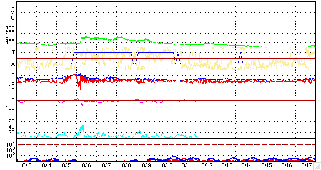 磁場強度も、7nTに強まっています。
