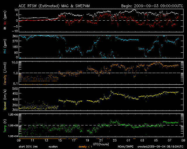 - 2009/ 8/31 09:43 太陽風がやや高速になっています。強い南向き磁場の影響で、オーロラ活動が強まりました。