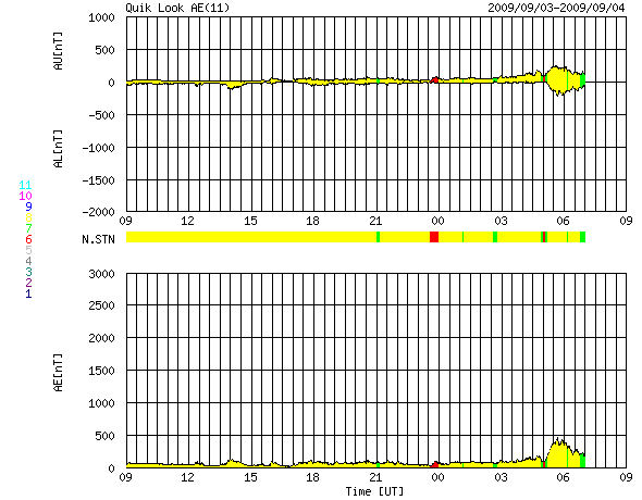 下段のAEグラフの値が高くなると、オーロラ活動が活発化しています。