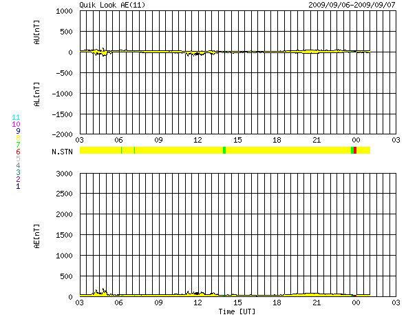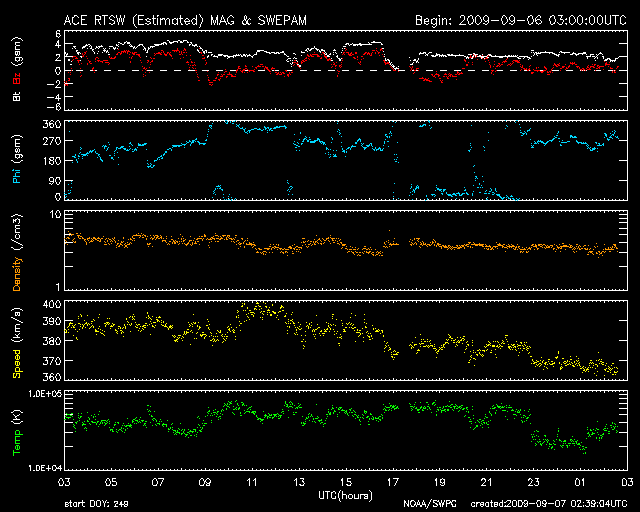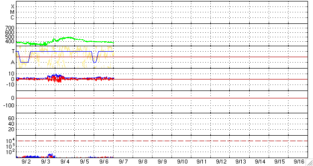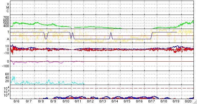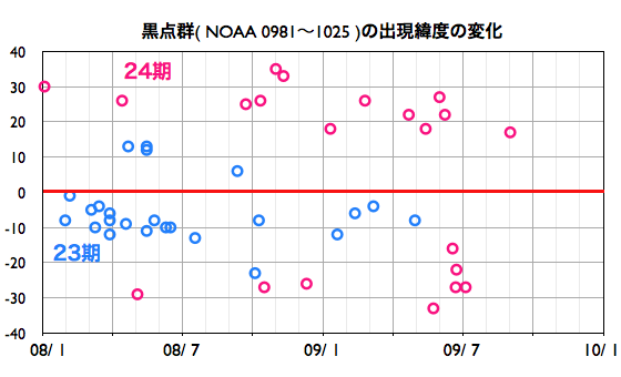 また、このグラフを今日1枚目の図として掲載します。 5月、6月、7月の無黒点日は、20日台前半に下がり、 いよいよ山を越えたのかと思ったのですが、 再び8月になって再び高い水準に戻りました(それも最高値です)。 長期変化ですので、1ヶ月単位でどうこうと評価することは無意味ですが、 現在の状態が変わるには、まだ時間がかかりそうな印象です。 2枚めに掲載している図は、 2008年1月に第24期最初の黒点群が出現して以来の、黒点群の活動周期番号と緯度の分布です。 これによると、北半球、南半球どちらも順調に第24期に切り替わっていて、 第23期の黒点群は今年の4月末以来、4ヶ月に渡って出現していません。 太陽の活動周期としては、完全に第24期に切り替わった様に見えます。 そして、現在の問題は、新しい第24期の活動度が一向に上昇しないということです。 第24期の極大における黒点数の予想は、日を追うごとに下がっています。 例えば、NASAのグループが発表している予想では、 第24期の極大は、2013年に黒点数は90くらいだとしています。 黒点数の予想は、様々なグループで出されていて、 もっと低い数値を発表しているものもあります。 今のところ、確実に予想できるモデルはなく、今後の推移を見守るしかありません。 太陽風は、速度380km/秒前後、磁場強度3nT前後と穏やかな状態です。 磁気圏もたいへん静穏です。 AE指数はほとんど変化していません。 穏やかな状態は今後も続くでしょう。 掲載の27日周期の図では、前周期のグラフの右端に、 ようやく次の太陽風の変化が顔を出しています。 太陽は無黒点で、とても静かです。 2006年7月以降の、月ごとの無黒点日数の変化。 (c) 作図 : 宇宙天気ニュース、データ : SIDC ![]() 2008年1月以降に出現した太陽黒点の緯度の変化。 (c) 作図 : 宇宙天気ニュース、データ : NOAA ![]() SOHO EIT195による、太陽コロナの様子。7日11時(世界時7日2時)。 (c) SOHO (ESA & NASA) ![]() ACEが観測した太陽風の磁場(1番上の枠、白線は全体の強度、赤線は南北成分) および、太陽風の密度(3番目の橙線)、速度(4番目の黄線) (c) NOAA/SWPC ![]() リアルタイムAE指数 下段のAEグラフの値が高くなると、オーロラ活動が活発化しています。 (c) 京都大学, NICT ![]() シベリアで観測された3日間の磁場データ 右側の3分の1が、昨日のデータになります。グラフが上がったり下がったりすると、オーロラ活動が活発化しています。 (c) NICT ![]() 27日の太陽周期に合わせたデータプロット 太陽が同じ面を地球に向けていた27日前の変化から、今後を予想することができます。 (c) NICT