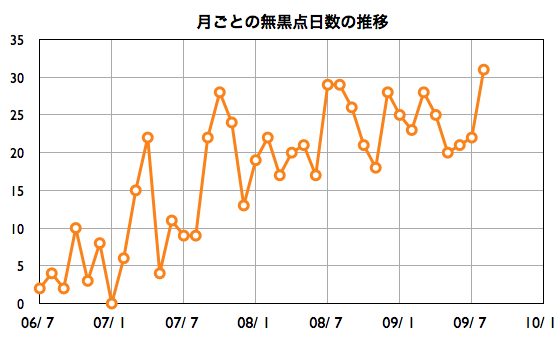2009/ 9/ 7 11:06 更新 太陽風、磁気圏ともに穏やかです。8月までの黒点数状況をまとめます。 担当 篠原 SIDCによると、8月の黒点のなかった日は、 1ヶ月あたりとしては最大値である31日に達したそうです。 無黒点の日は、2007年頃から増えていますが、 月あたりの日数としては、今回の極小期中、最多になりました。 次の表は、2006年11月以降の月ごとの無黒点日の推移です。