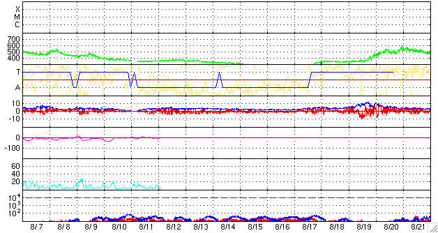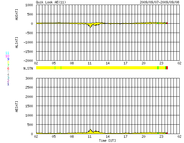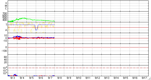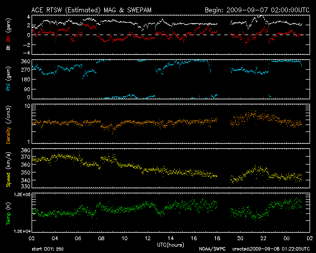 2009/ 9/ 8 10:22 更新 太陽風の速度は350km/秒に下がり、磁気圏もとても静かです。太陽は無黒点を続けています。 担当 篠原 太陽風の速度は、じわじわと下がり続け、350km/秒まで下がりました。 すっかり低速風になっています。 磁場強度も、2-3nTあたりに留まっていて、弱まったままです。 とても穏やかな太陽風が続いています。 27日周期の図を見ると、前周期はこの後更に速度が下がって、 300km/秒を割るほどになっています。 今回も、同様に静かな太陽風が続きそうです。 磁気圏活動は、とても静かです。 AEのグラフの真ん中に、やっと200nTくらいの小規模のオーロラ活動が見られますが、 こんな小さな変化が目立つほどの静かさです。 この後も1週間ほど、9月15日頃まで静かに過ぎて行くでしょう。 太陽も非常に静かです。 黒点はもちろん無く、EIT195の写真には、明るい領域すらありません。 SOHO EIT195による、太陽コロナの様子。8日4時半(世界時7日19時半)。 (c) SOHO (ESA & NASA) ![]() ACEが観測した太陽風の磁場(1番上の枠、白線は全体の強度、赤線は南北成分) および、太陽風の密度(3番目の橙線)、速度(4番目の黄線) (c) NOAA/SWPC ![]() リアルタイムAE指数 下段のAEグラフの値が高くなると、オーロラ活動が活発化しています。 (c) 京都大学, NICT ![]() シベリアで観測された3日間の磁場データ 右側の3分の1が、昨日のデータになります。グラフが上がったり下がったりすると、オーロラ活動が活発化しています。 (c) NICT ![]() 27日の太陽周期に合わせたデータプロット 太陽が同じ面を地球に向けていた27日前の変化から、今後を予想することができます。 (c) NICT