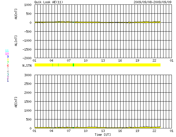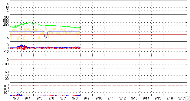 2009/ 9/ 9 09:32 更新 太陽風は低速で、磁気圏もたいへん穏やかです。 担当 篠原 GOES衛星による、太陽X線のグラフにB2ほどの小さなフレア活動が発生しています。 これは、SOHO EIT195の西の端(右端)に、小さく光っている部分で発生したものです。 ここは、9月1日に発生した1025黒点群のあった場所です。 STEREO Aheadの動画などを参考にすると、活動度が少し高まっている様で、 あるいは黒点にまで発達するのかもしれません。 ただし、もう向こう側に回ってしまうので、確認することはできないでしょう。 低速の太陽風が続いています。 速度は更に下がって、310km/秒ほどになっています。 前周期同様に、300km/秒を割るほどになるのかもしれません。 磁気圏も非常に静穏です。 AE指数は全く変化がなく、真っ平らです。 27日周期の図より、次の擾乱は、 8月20日の27日後にあたる9月16日頃ではないかと考えていましたが、 もう少し遅くなるかもしれません。 今日のSOHO EIT195では、コロナホールが東端の北半球側にかろうじて見えていますが、 前周期よりも東側に動いているようなのです。 もう2日ほどすると、はっきりと分かる様になるでしょう。 SOHO EIT195による、太陽コロナの様子。9日3時(世界時8日18時)。 (c) SOHO (ESA & NASA) ![]() SOHOによる、太陽可視光写真。無黒点ですが、西の端に白斑が見えます。9日2時半(世界時8日17時半)。 (c) SOHO (ESA & NASA) ![]() GOES衛星の太陽X線データ (c) NOAA/SWPC ![]() ACEが観測した太陽風の磁場(1番上の枠、白線は全体の強度、赤線は南北成分) および、太陽風の密度(3番目の橙線)、速度(4番目の黄線) (c) NOAA/SWPC ![]() リアルタイムAE指数 下段のAEグラフの値が高くなると、オーロラ活動が活発化しています。 (c) 京都大学, NICT ![]() シベリアで観測された3日間の磁場データ 右側の3分の1が、昨日のデータになります。グラフが上がったり下がったりすると、オーロラ活動が活発化しています。 (c) NICT ![]() 27日の太陽周期に合わせたデータプロット 太陽が同じ面を地球に向けていた27日前の変化から、今後を予想することができます。 (c) NICT
