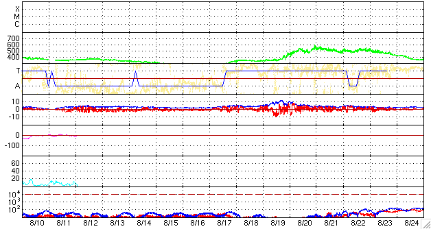 磁場強度は、5〜6nTと平均的なレベルにやや強まっています。